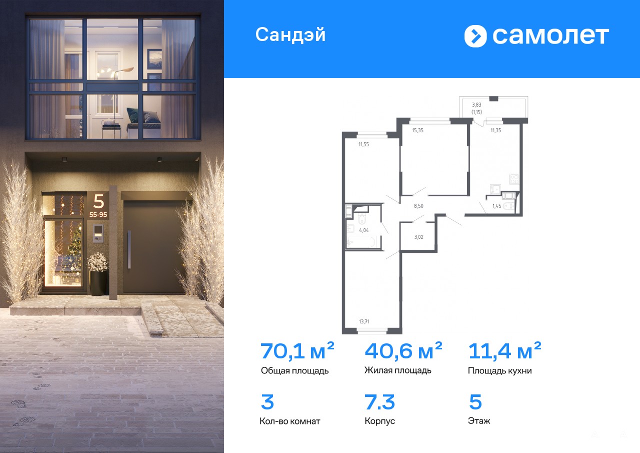 Строим кварталы для жизни с заботой о будущем. Предлагается 3-комнатная квартира комфорт-класса 70, 12 кв.м в корпусе 7.3 на 5 этаже, в ЖК «Сандэй»