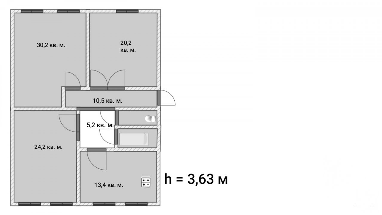 Общая площадь квартиры - 108, 7 кв.м, кухня - 13, 40 кв.м, комнаты - 24.20, 30.20 и 20.20 кв.м, потолки 3.63 м.