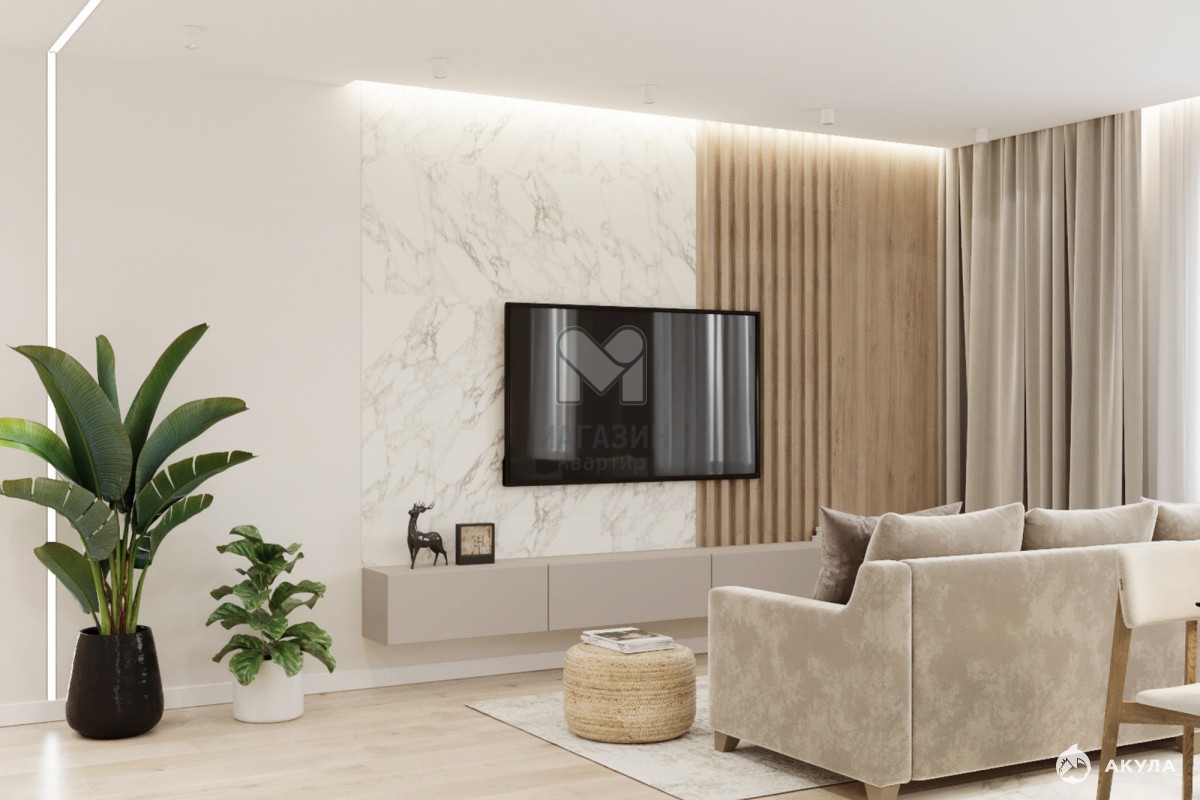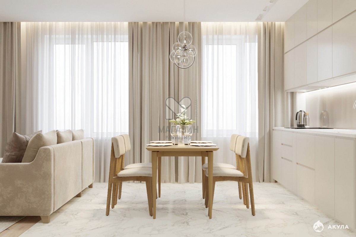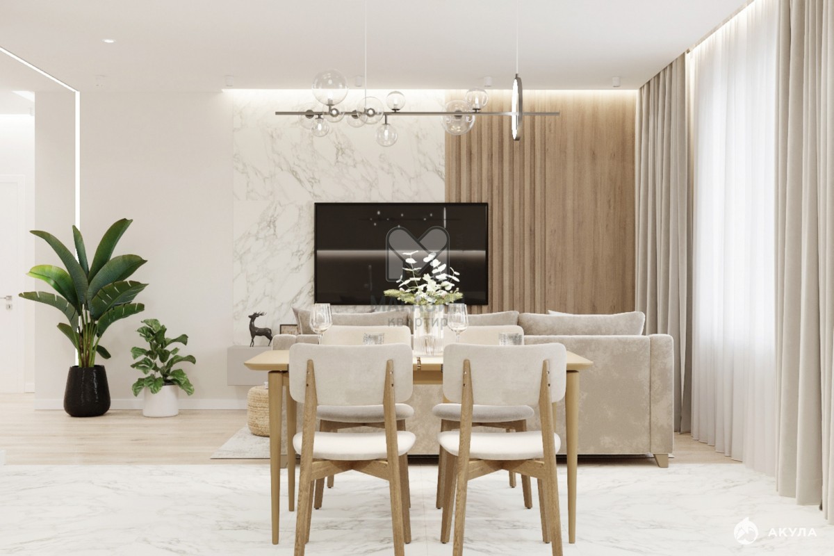 Просторная кухня-гостиная площадью 31 м² станет центром притяжения для всей семьи и друзей: здесь будет удобно готовить, проводить время вместе и устраивать ужины.