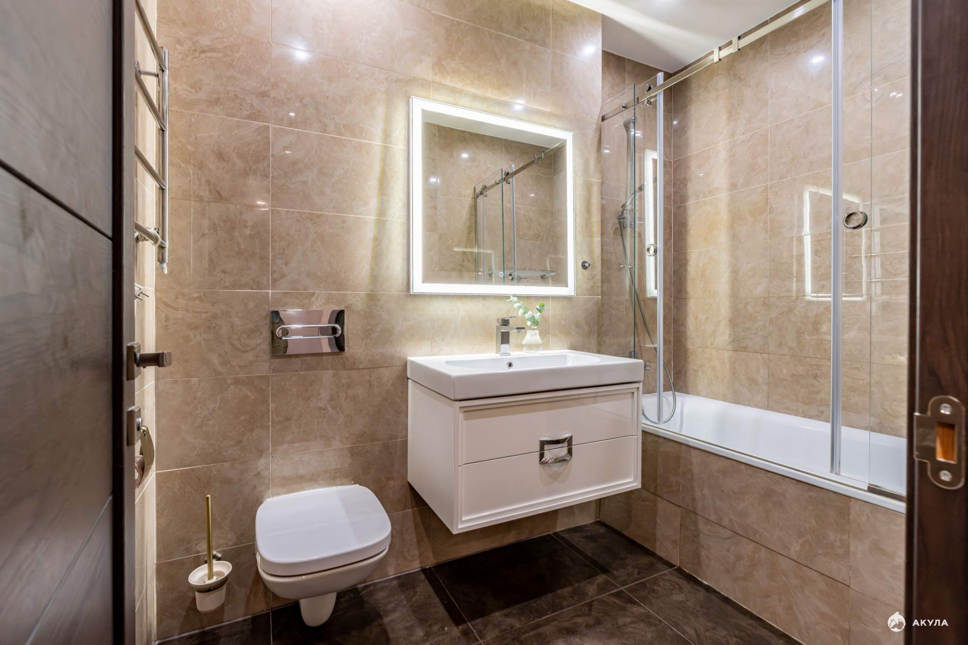 Кухня полностью оснащена: встроенный холодильник, варочная панель, вытяжка, духовой шкаф, микроволновая печь, продуманное освещение.