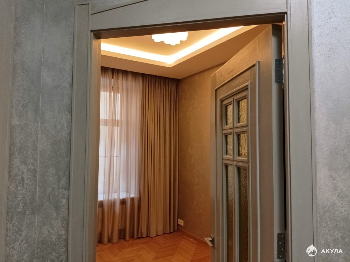 В квартире выполнен дизайнерский ремонт. Декоративная штукатурка, наборный паркет.