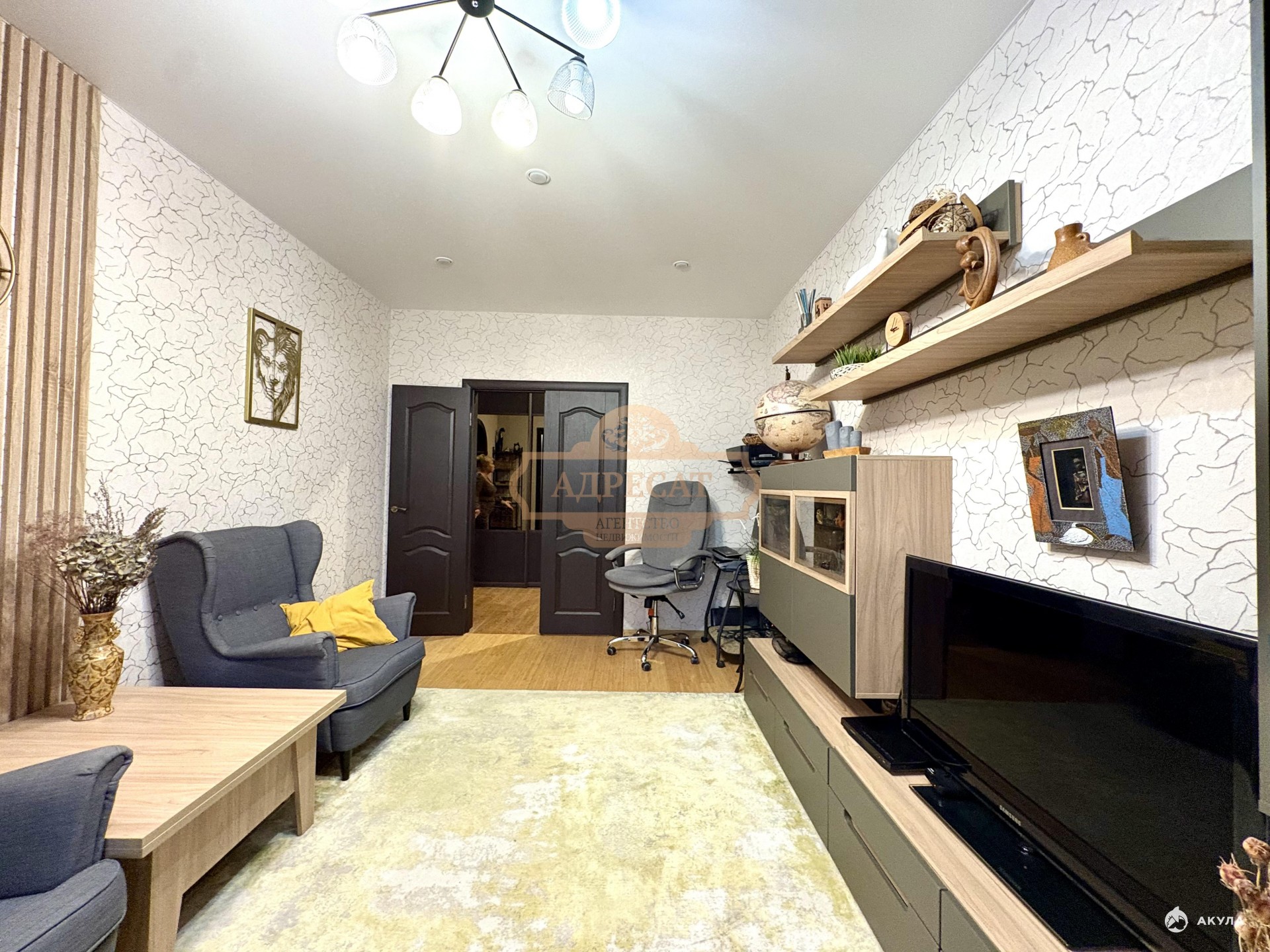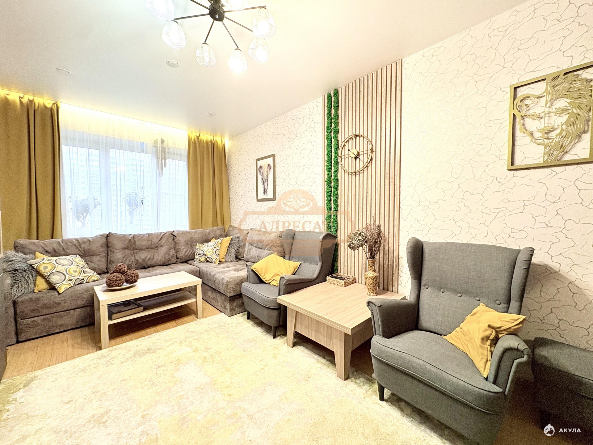 Кухня гостиная с встроенным новым полностью укомплектованным кухонным гарнитуром и выходом на остекленную лоджию отлично разместит большую семью и гостей.