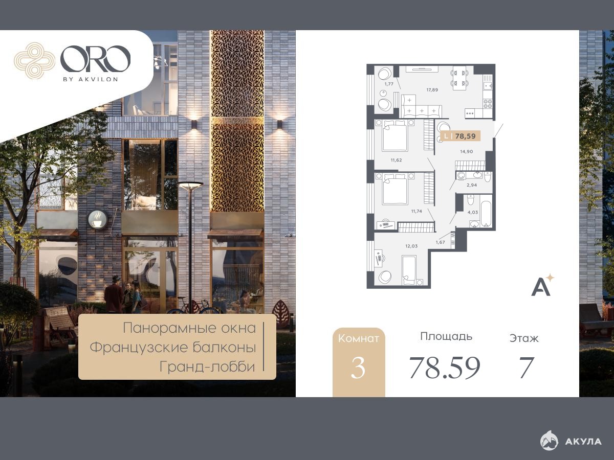 Продается трехкомнатная квартира от застройщика с отделкой в ЖК "ORO by Akvilon" на 7 этаже. Общая площадь: 78.59 кв.м., жилая: 35.39 кв.м., площадь просторной кухни-столовой: 17.89 кв.м. Комнаты изолированные, все окна выходят на одну сторону. В квартире одна лоджия, один совмещенный и один раздельный санузел. Высота потолков 2.85 м.