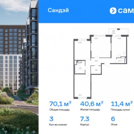 Строим кварталы для жизни с заботой о будущем. Предлагается 3-комнатная квартира комфорт-класса 70, 12 кв.м в корпусе 7.3 на 6 этаже, в ЖК «Сандэй» Квартира с чистовой отделкой. Доступность дополнительных опций уточняйте у застройщика. Приобрести квартиру возможно по...