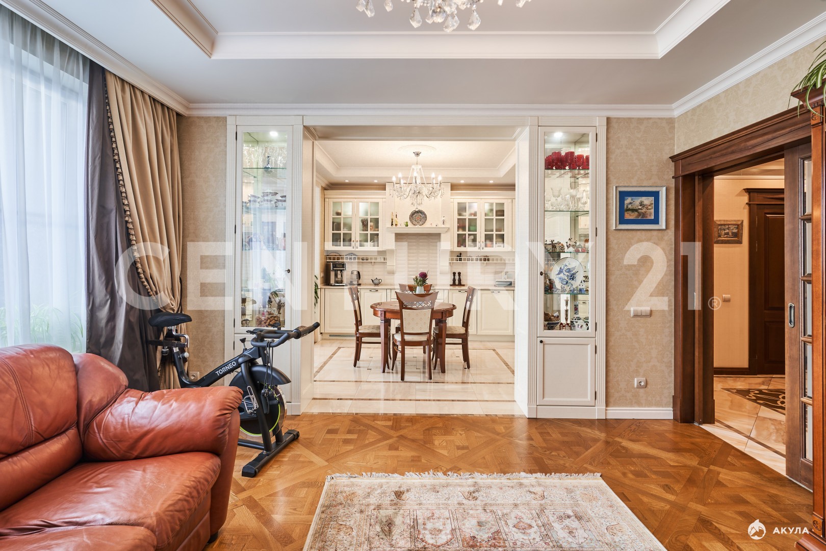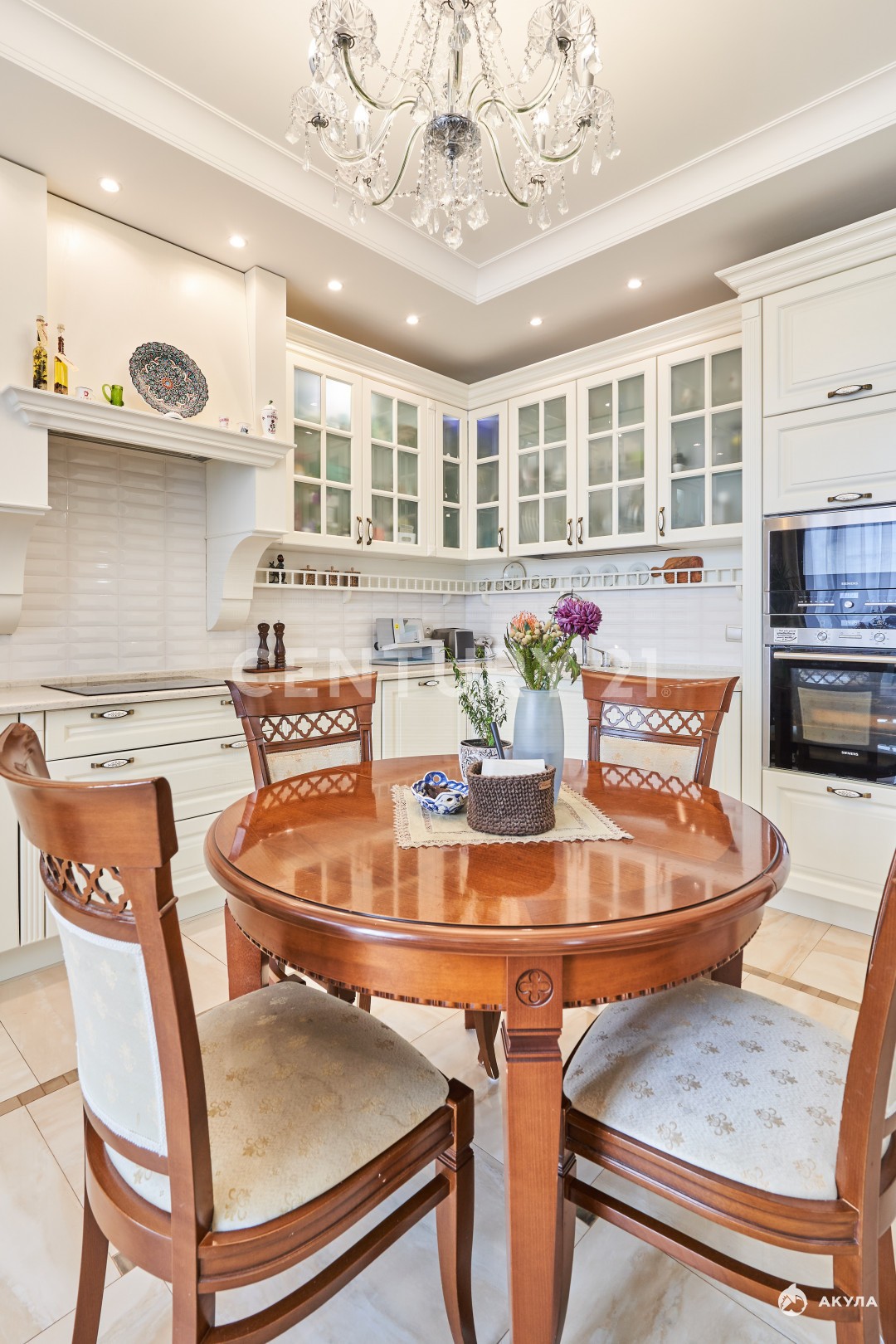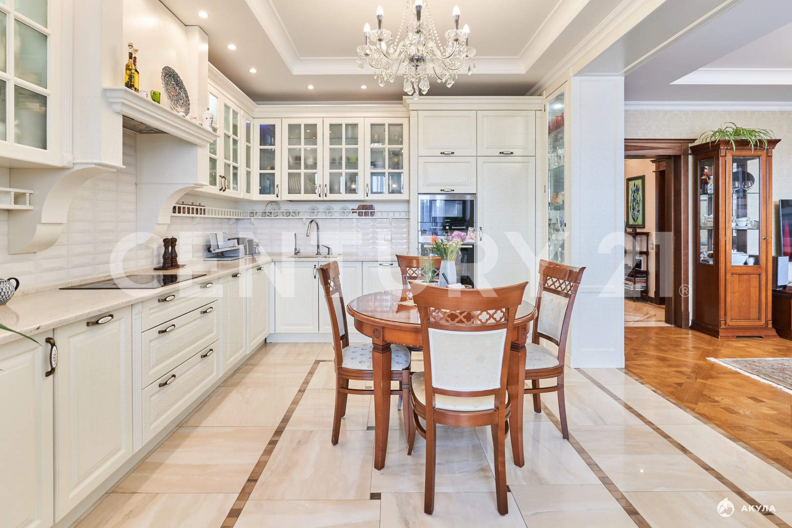 Главная зона — огромная гостиная, объединенная со столовой, — место для вдохновляющих встреч и уютных семейных вечеров. Каждый элемент интерьера продуман до мелочей: дизайнерский ремонт, выполненный в викторианском стиле, гармонично сочетается с изысканной итальянской мебелью из массива, придающей помещению тепло и статусность.