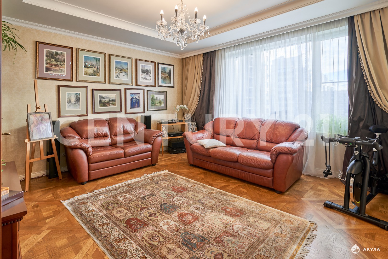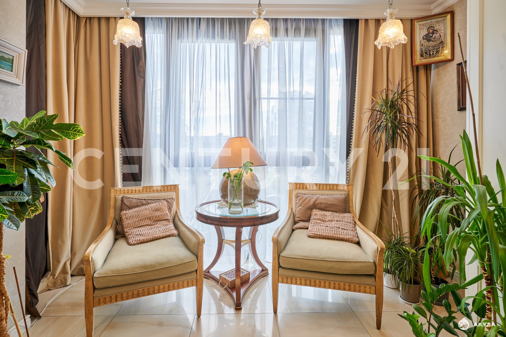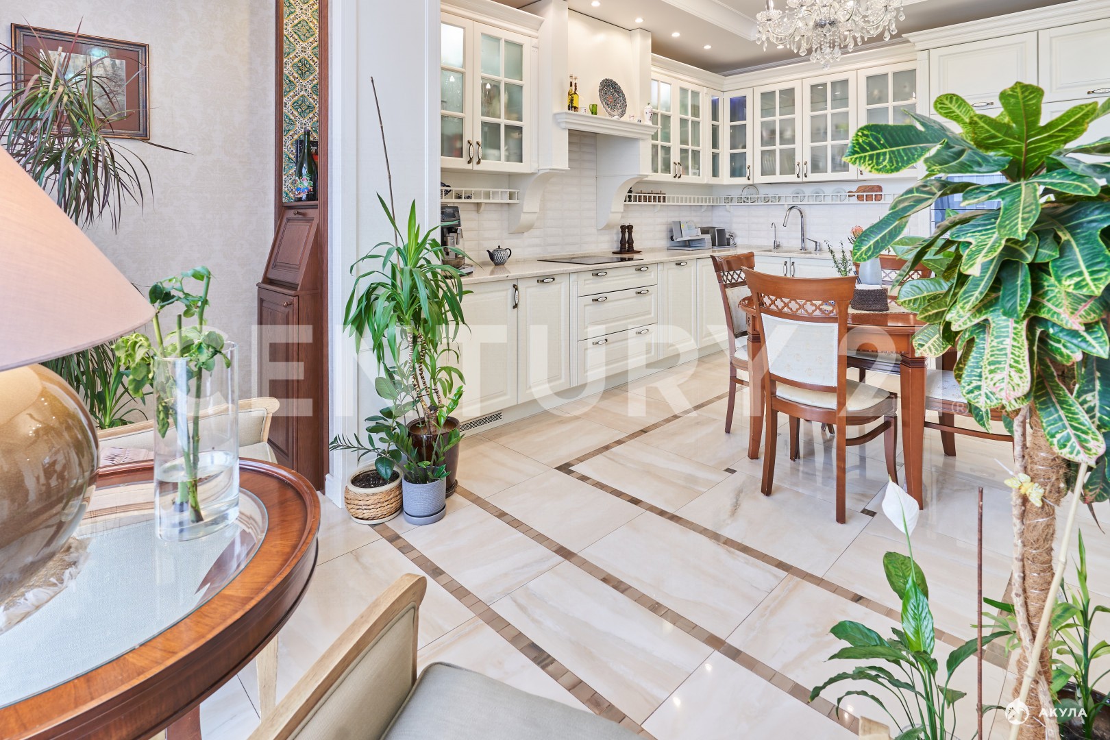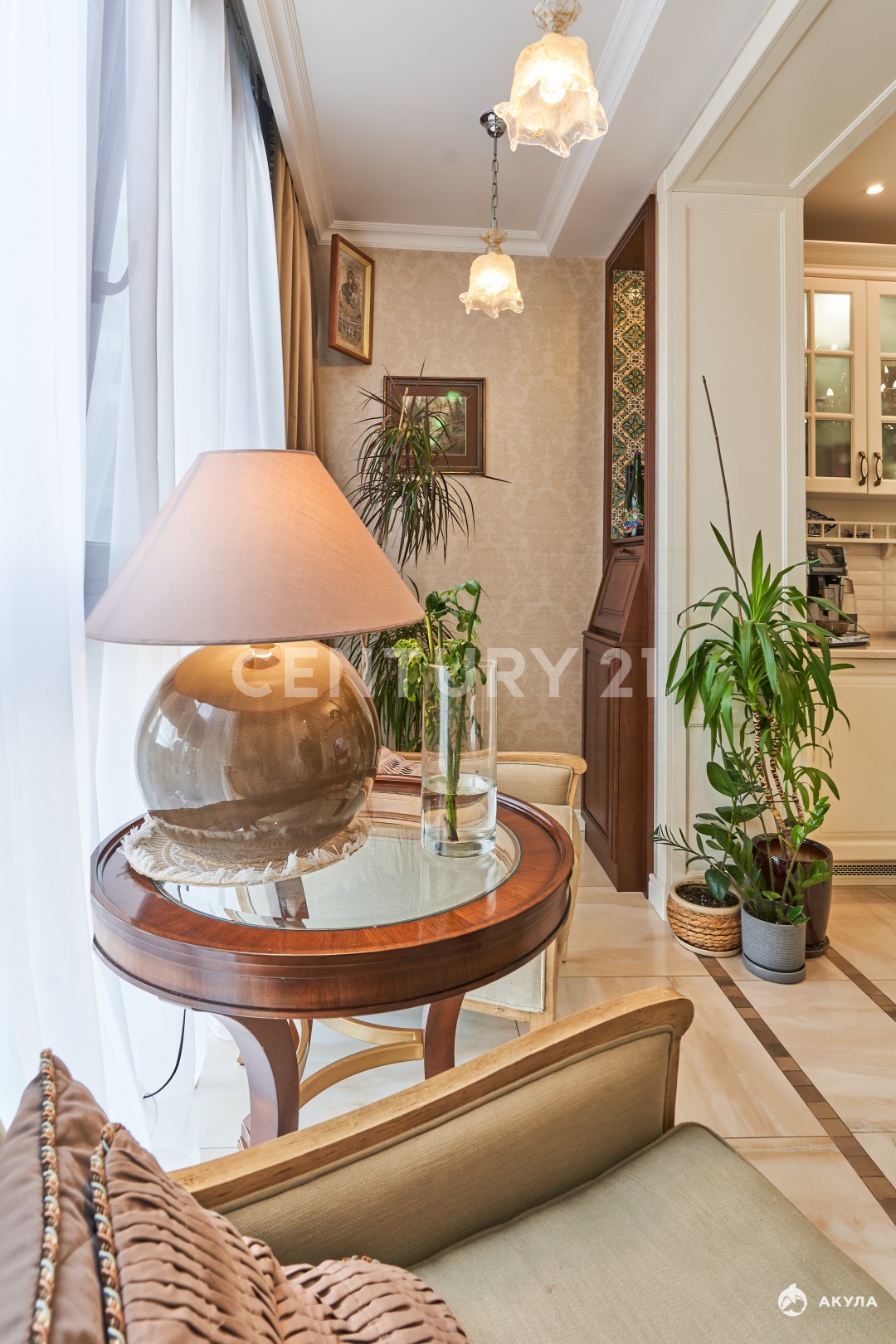Главная зона — огромная гостиная, объединенная со столовой, — место для вдохновляющих встреч и уютных семейных вечеров. Каждый элемент интерьера продуман до мелочей: дизайнерский ремонт, выполненный в викторианском стиле, гармонично сочетается с изысканной итальянской мебелью из массива, придающей помещению тепло и статусность.