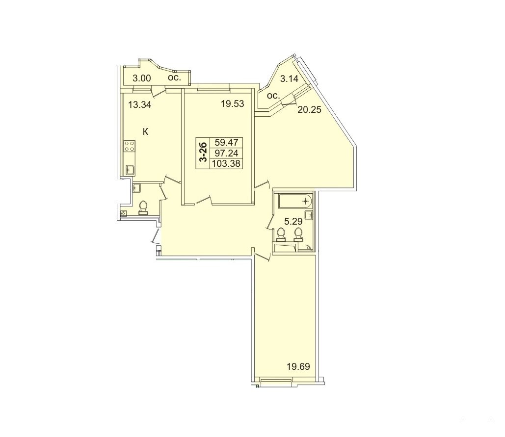 Светлые комнаты: 20, 25+ 19, 69 + 19, 53 м²