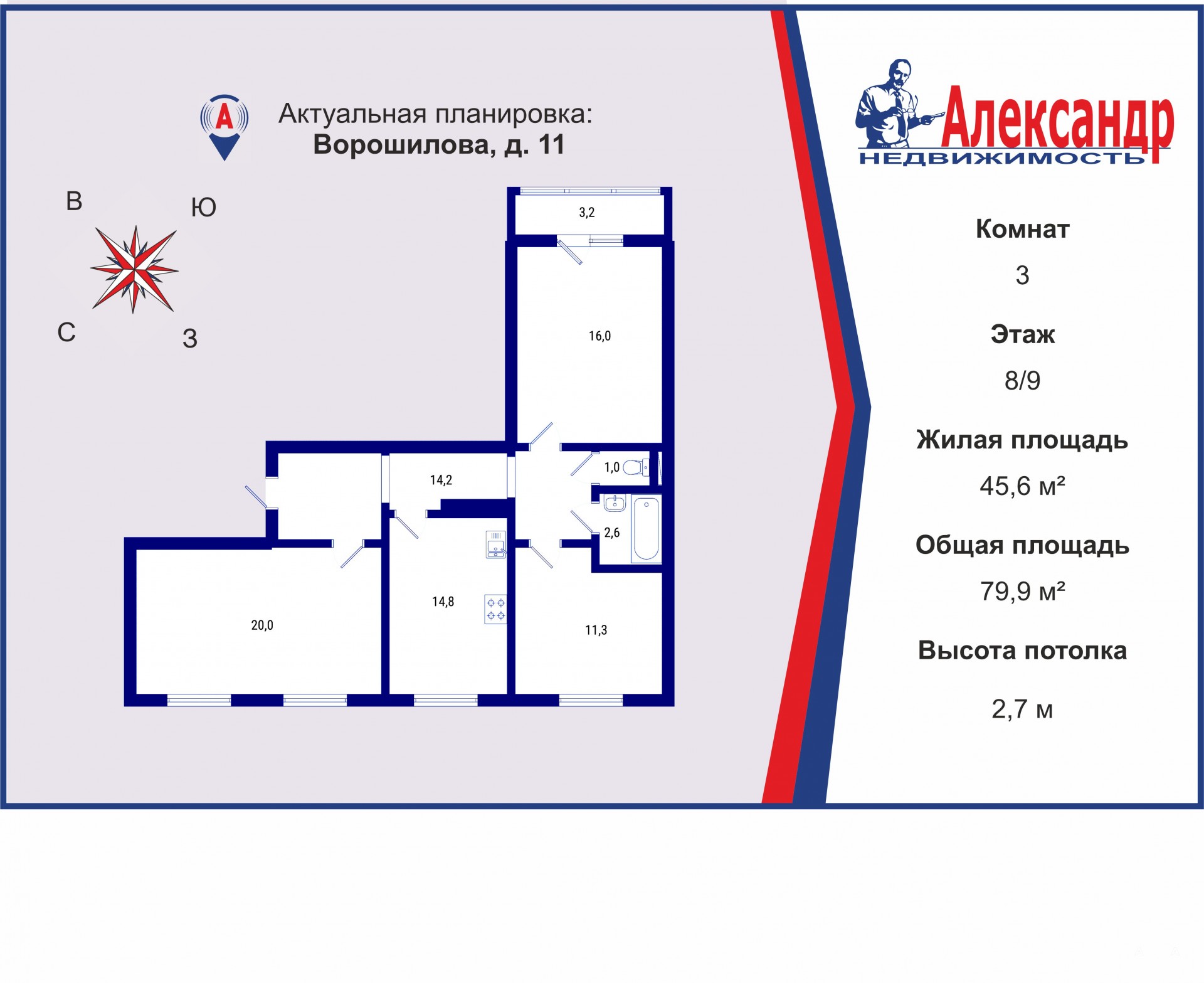 1702804 В прямой продаже светлая 3-комнатная квартира 79, 9 м2 с балконом недалеко от м. Пр. Большевиков!