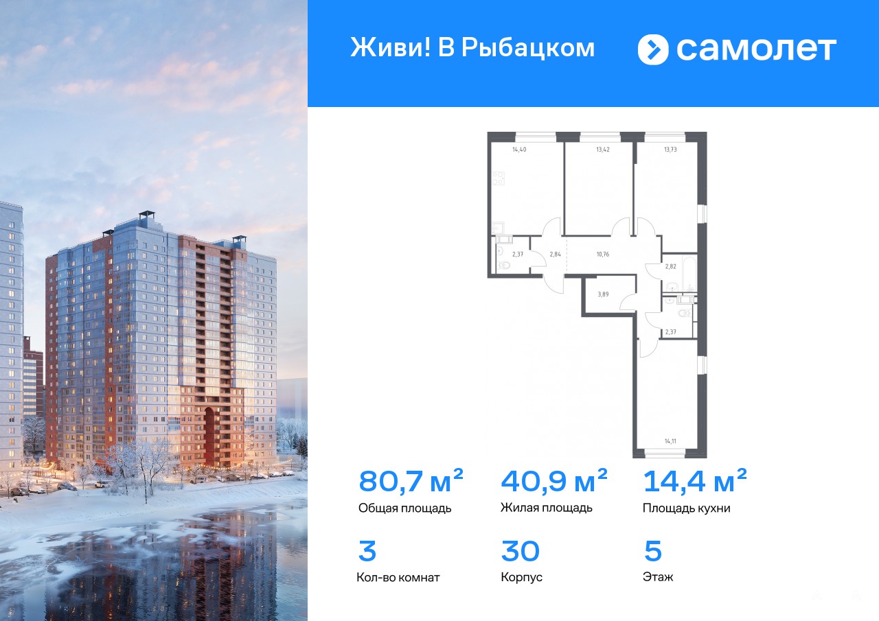 Строим кварталы для жизни с заботой о будущем. Предлагается 3-комнатная квартира комфорт-класса 80, 71 кв.м в корпусе 30 на 5 этаже, в ЖК «Живи! В Рыбацком»