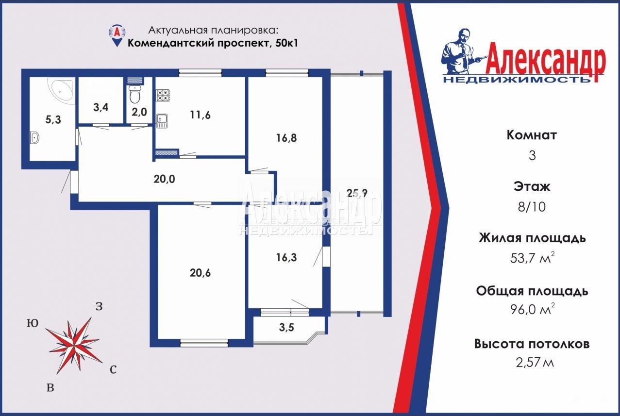 1698297 В престижном Приморском районе продается очень просторная трехкомнатная квартира с уникальной двухсторонней планировкой с двухсторонней лоджией и балконом!