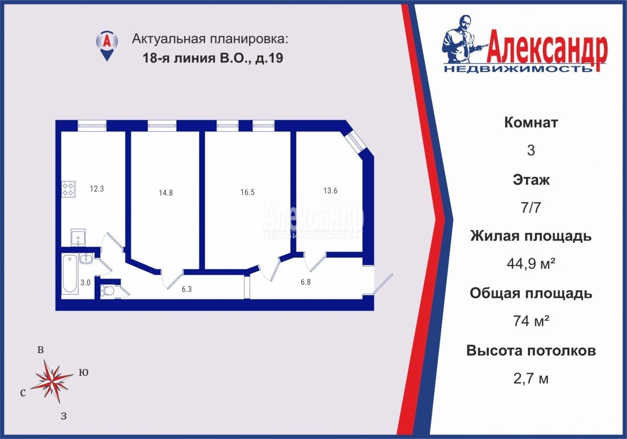 1699255 Продаётся 3-х комнатная квартира в престижном квартале Васильевского острова - угол 18 линии и Большого пр.