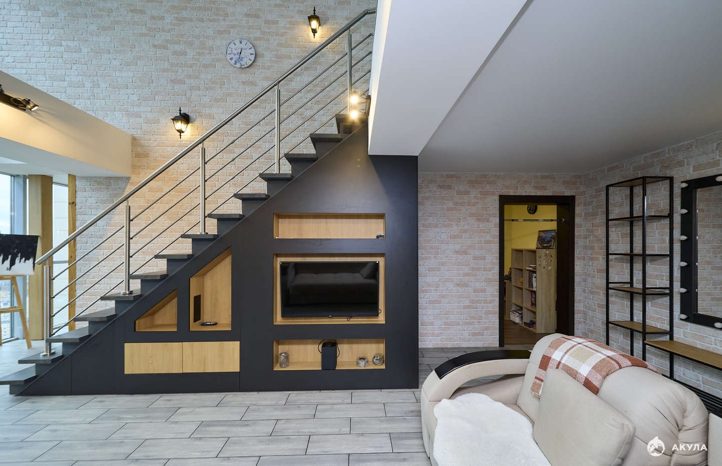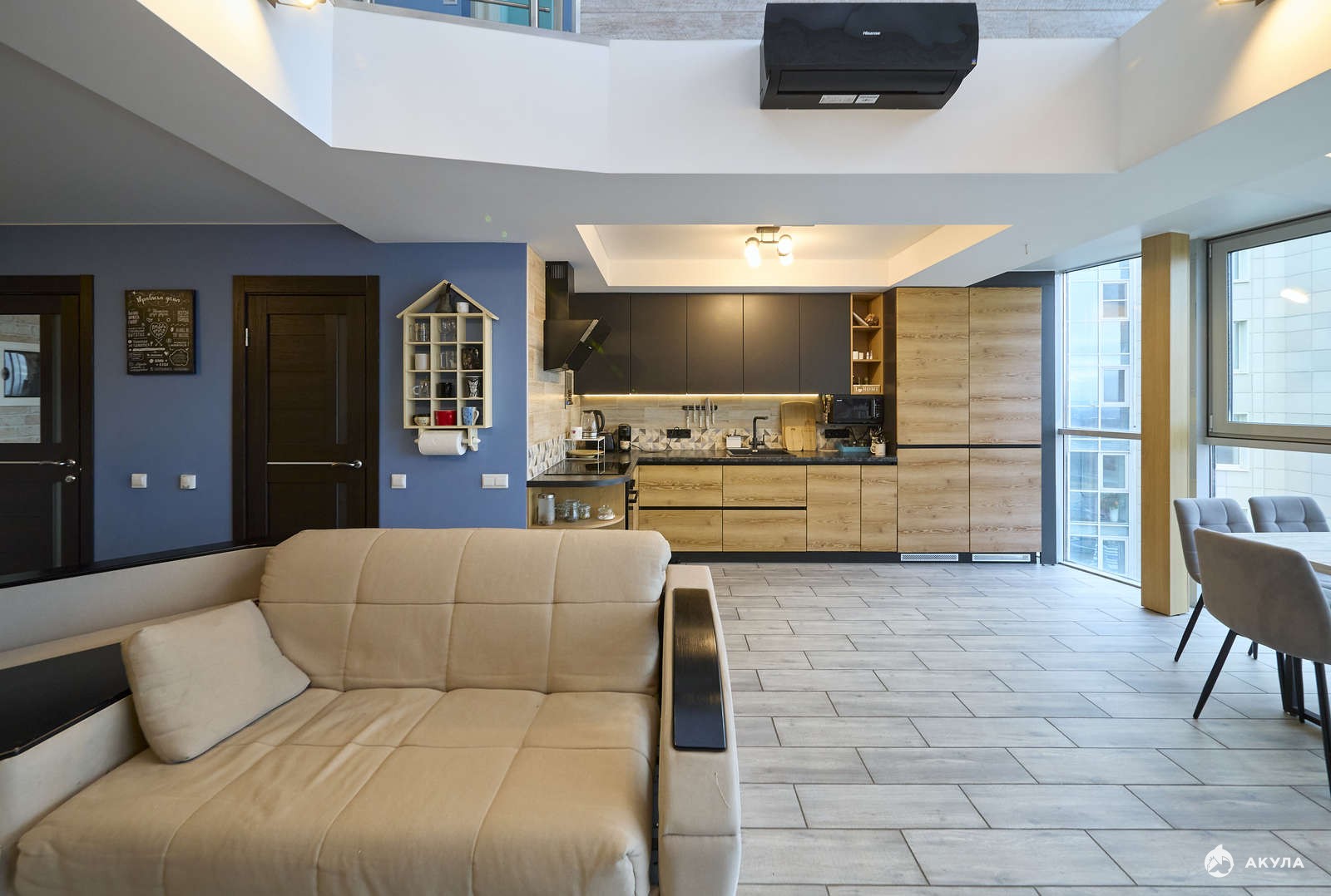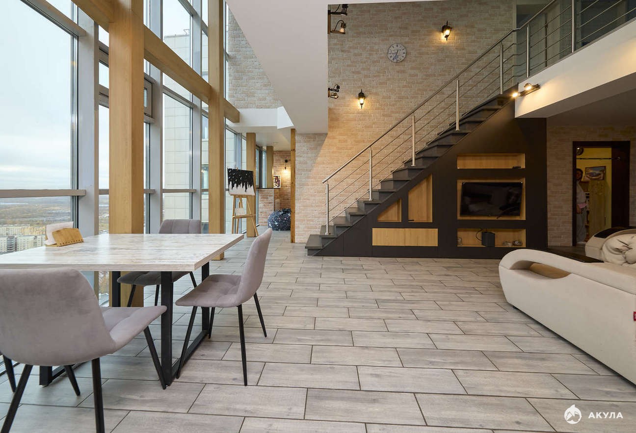 Квартира двухуровневая, три полноценные спальни, кухня-гостиная 45 метров, 2 санузла, большое помещение на втором этаже для хранения сезонных вещей.