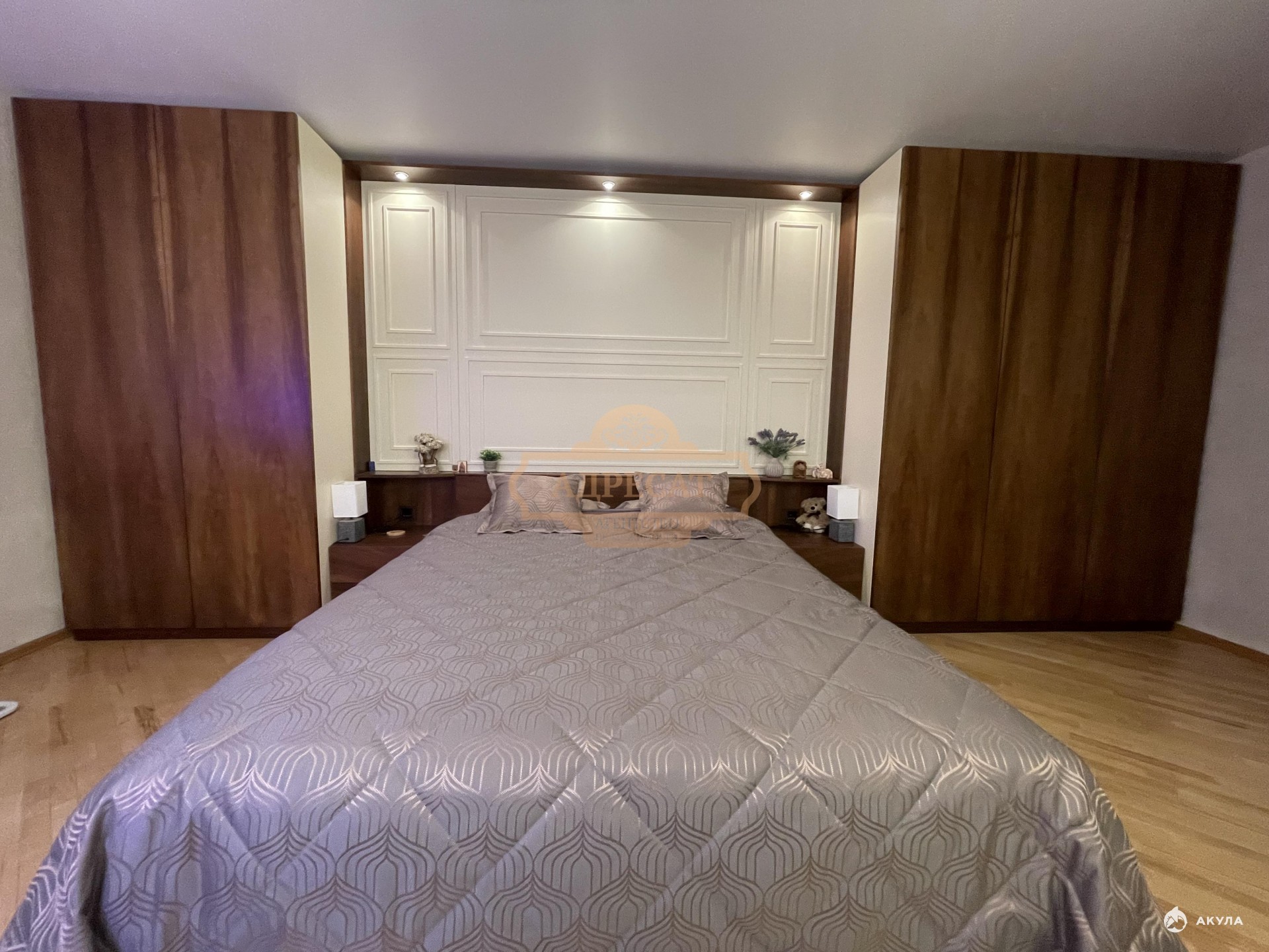 Мебель в спальне изготовлена под заказ из качественных натуральных материалов, в том числе с использованием шпона ореха. На кухне установлены встроенная варочная панель и духовой шкаф BOSCH.