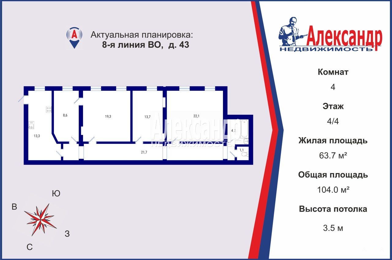 1701798 В продаже 4х комнатная квартира, расположенная на 4 этаже 4х этажного дома, 8й линии В.О. в доходном доме А.И.Кракау. Общая площадь 104 кв.м, два собственника, более 5 лет в собственности. В шаговой доступности от метро "Василеостровская". Рассматриваем ипотеку, рассрочку и пр. Документы готовы. Показы в удобное время.