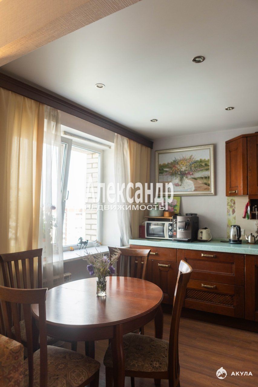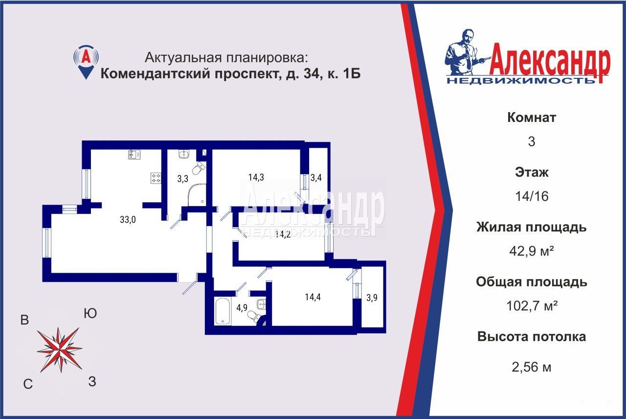 - Квартира общей площадью 109, 6 м². Три отдельные комнаты: кабинет14, 3 м² (плюс лоджия 3, 4 м²), комната 14, 4 м² (плюс лоджия 3, 5 м²) и спальня 14, 2 м². Кухня -гостиная 33 м² с привлекательным видом на просторы Комендантского проспекта. Большая прихожая, коридор. Два просторных санузла: в одном установлена душевая кабина, во втором ванна.