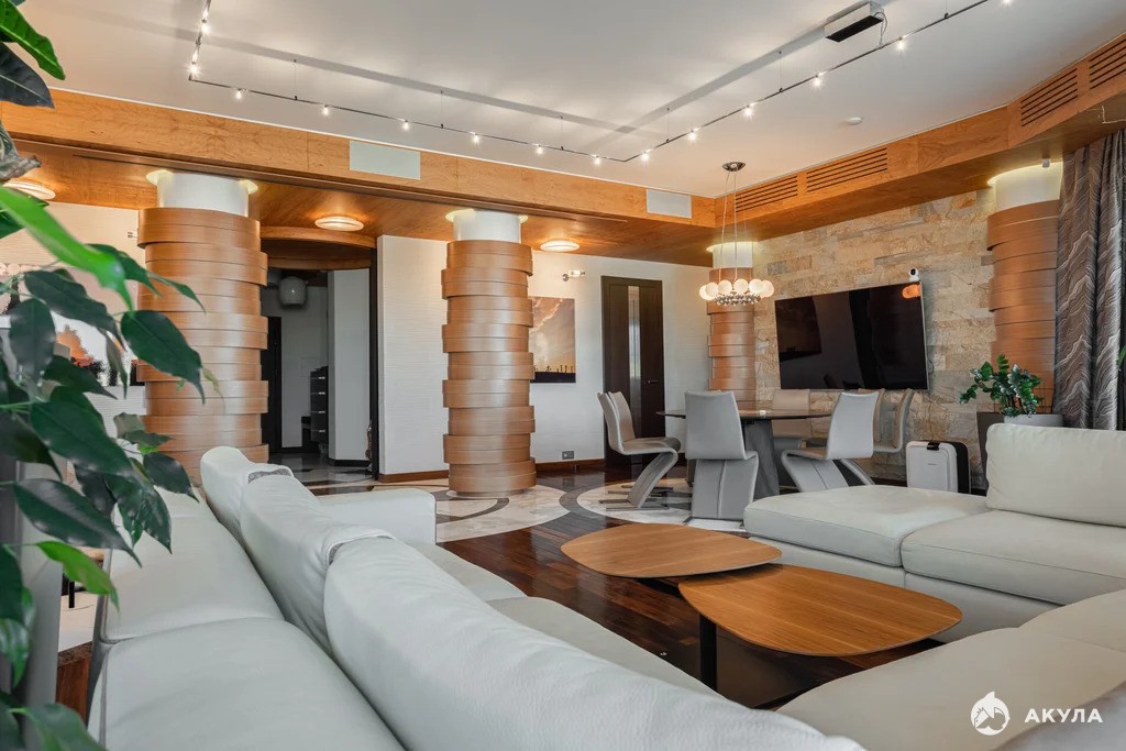 Квартира с продуманной и официально согласованной планировкой и террасой: над и под квартирой расположены технические этажи, что дает абсолютную приватность и звукоизоляцию, огромная гостиная 50 м с выходом в зимний сад и столовую со вторым светом, отдельная кухня, мастер-спальня со своей гардеробной и ванной комнатой, турецкая парная, кабинет, две просторные комнаты, постирочная комната.