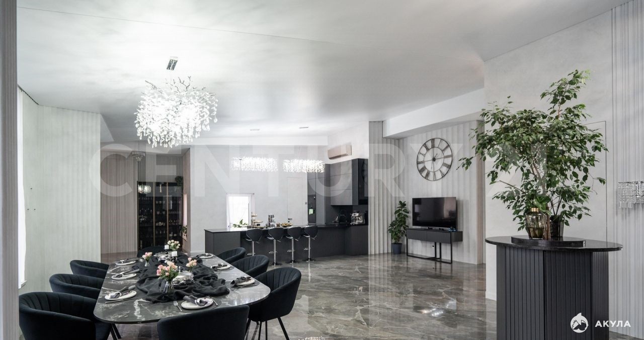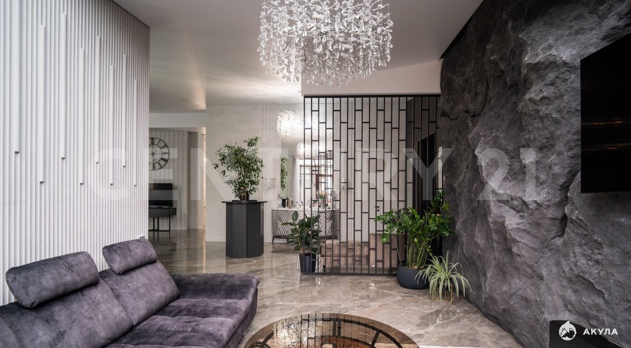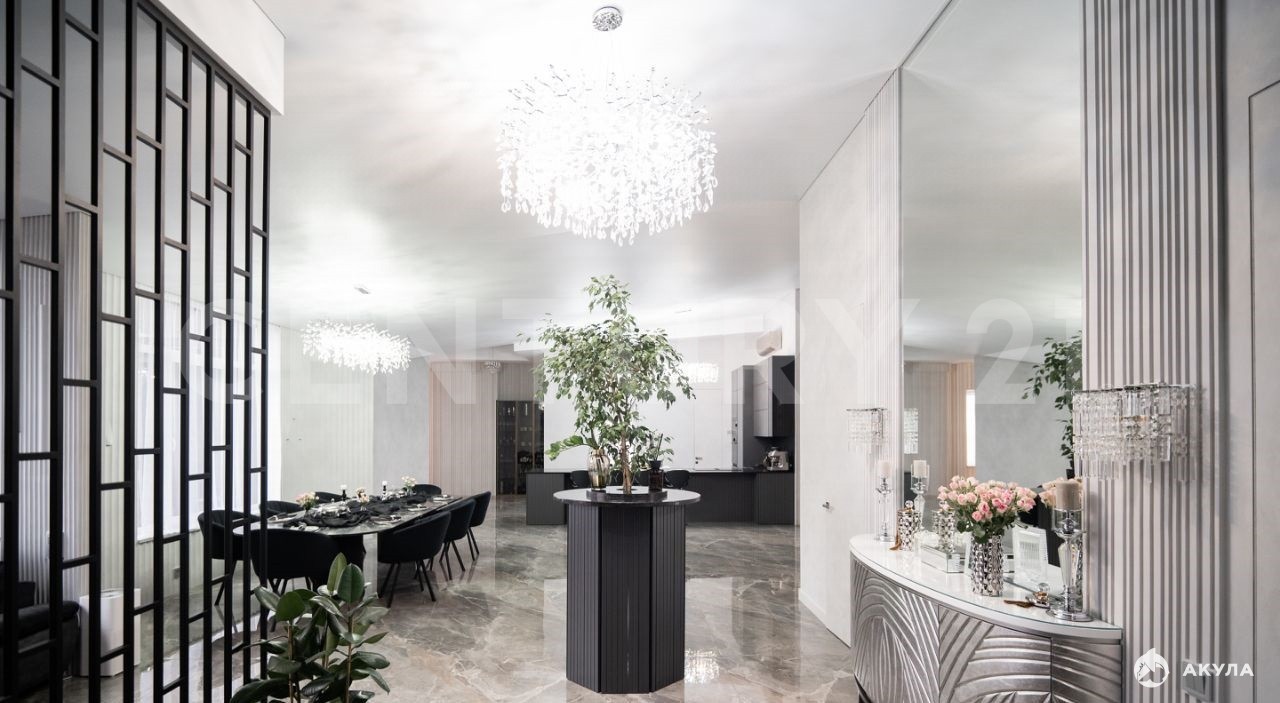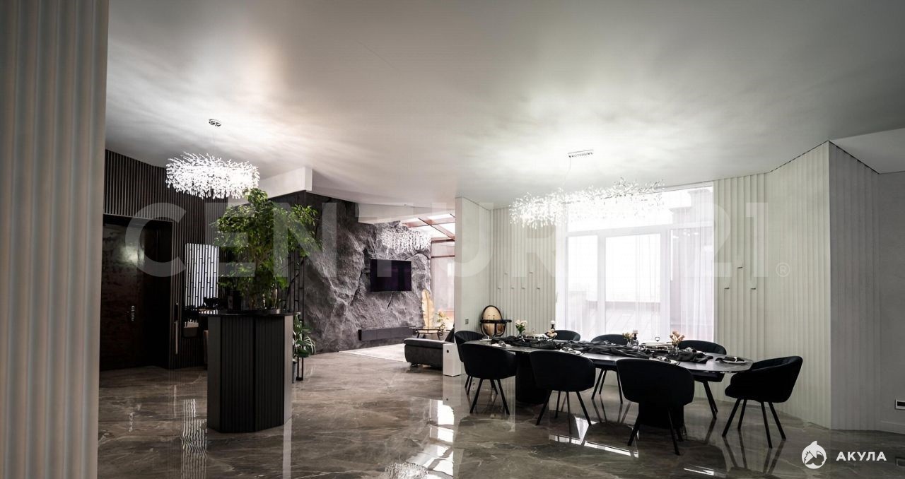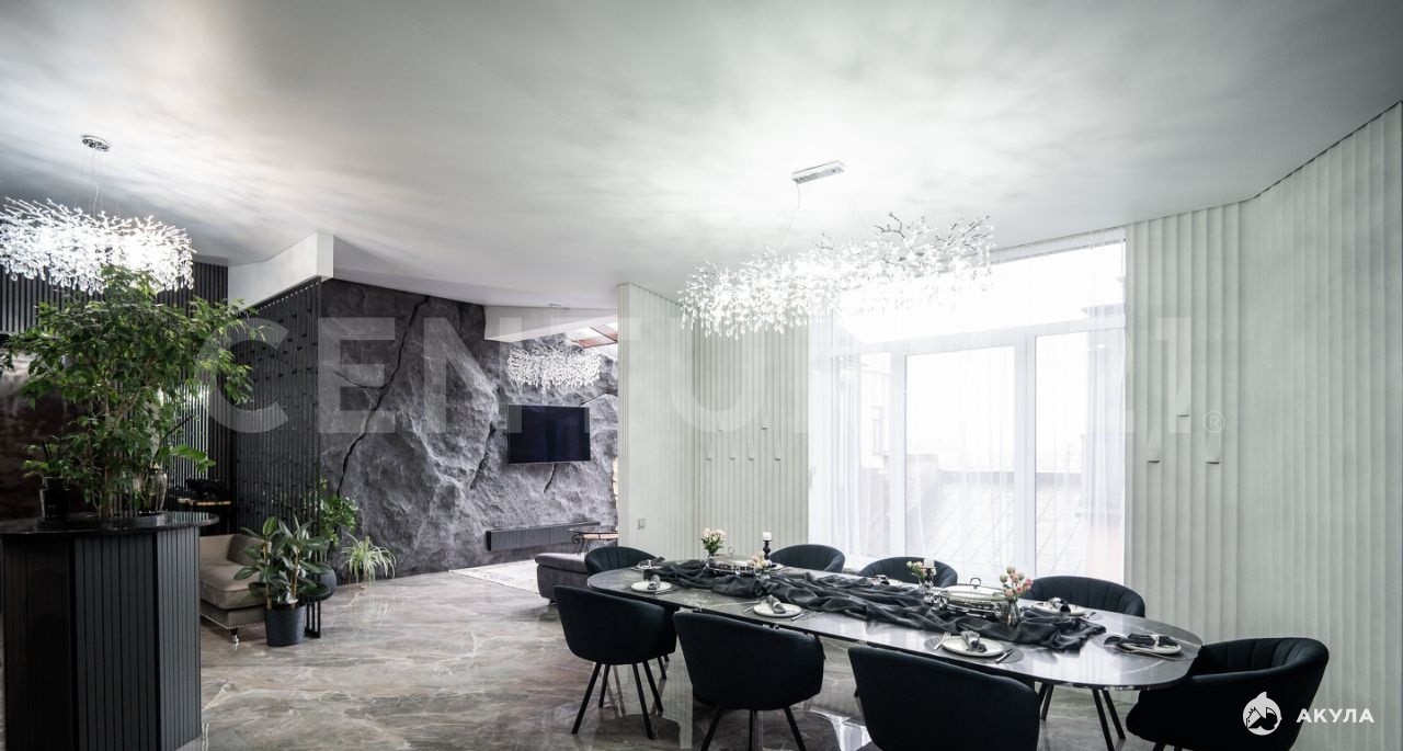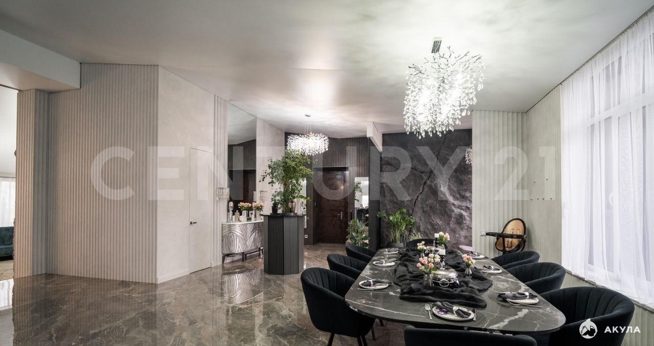 Продуманная планировка делит квартиру на три функциональные зоны, приватную зону спален с окнами во двор, коридор оснащен окнами выходят на ул. Чернышевского, большая гостевая гостиная-столовая, с зоной отдыха стена в которой выполнена в технике имитации скального рельефа, и хозяйская гостиная с зоной отдыха и огромной скалой, с выходом на террасу на ул. Чайковского. На террасе положена доска, установлен блок кондиционера. В квартире панорамные окна и виды на три стороны света и красоты Петербурга. Три отдельных сан. узла с современной сантехникой и оборудованные умными японскими унитазами. Две просторные гардеробные комнаты, отдельный хоз. блок- постирочная, оборудованная новой бытовой техникой. Просторная кухонная зона с каменной столешницей и островом который вмещает в себя всю кухонную утварь с одной стороны и переходит в уютную барную зону с другой стороны, полностью оборудованная новой техникой. Огромный обеденный стол, длина 3200 с каменной столешницей.