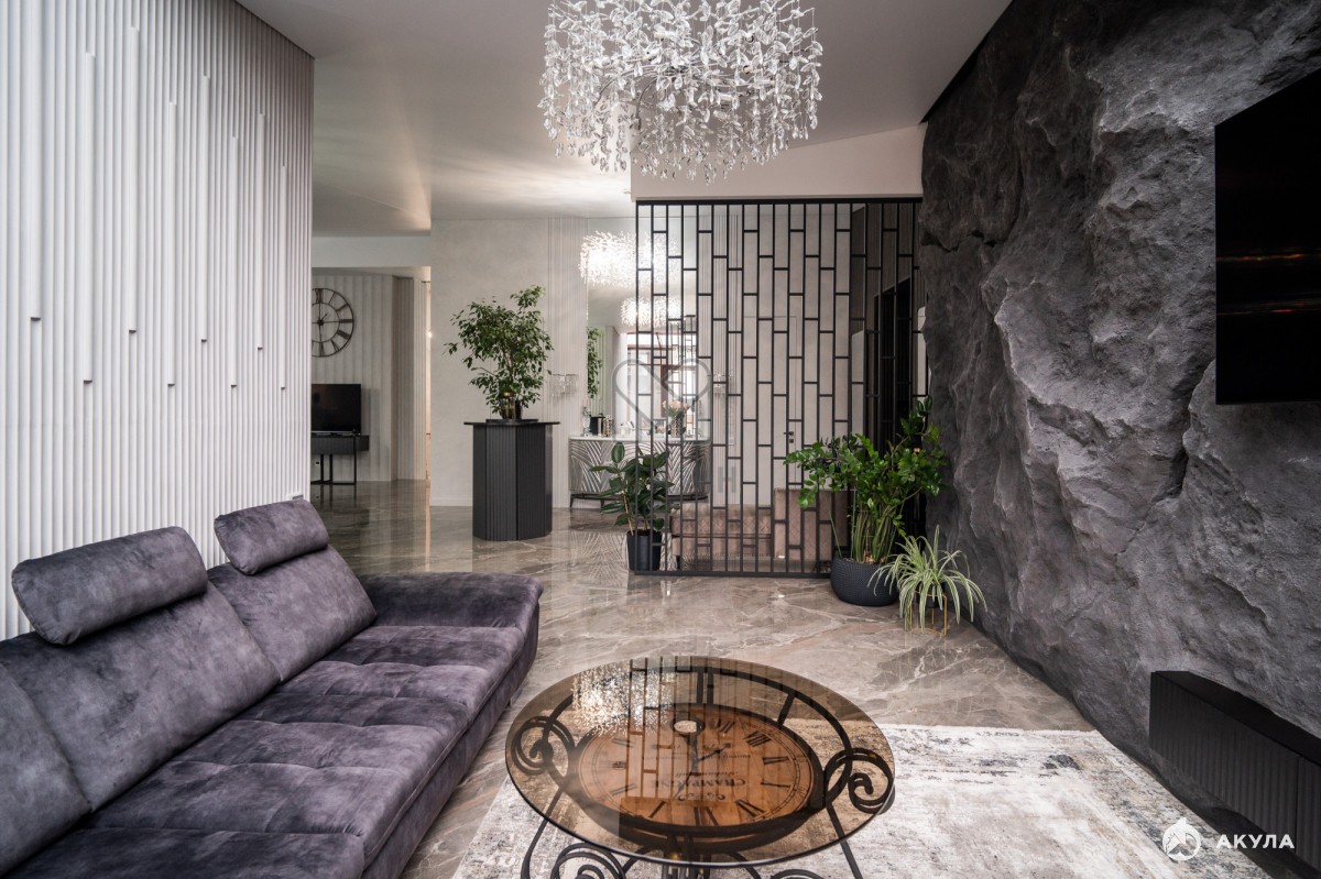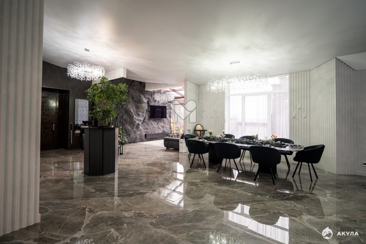 Внутренняя отделка квартиры выполнена в стиле дизайнерский евроремонт, где гармонично сочетаются натуральные дорогие отделочные материалы создавая изысканную атмосферу. Три смежных санузла оборудованных импортной умной сантехникой обеспечат удобство для всех членов семьи, а шикарная кухня-гостинная площадью 100 квадратных метров станет настоящим сердцем вашего дома, где можно провести время за приготовлением вкусных ужинов и общением с близкими.
