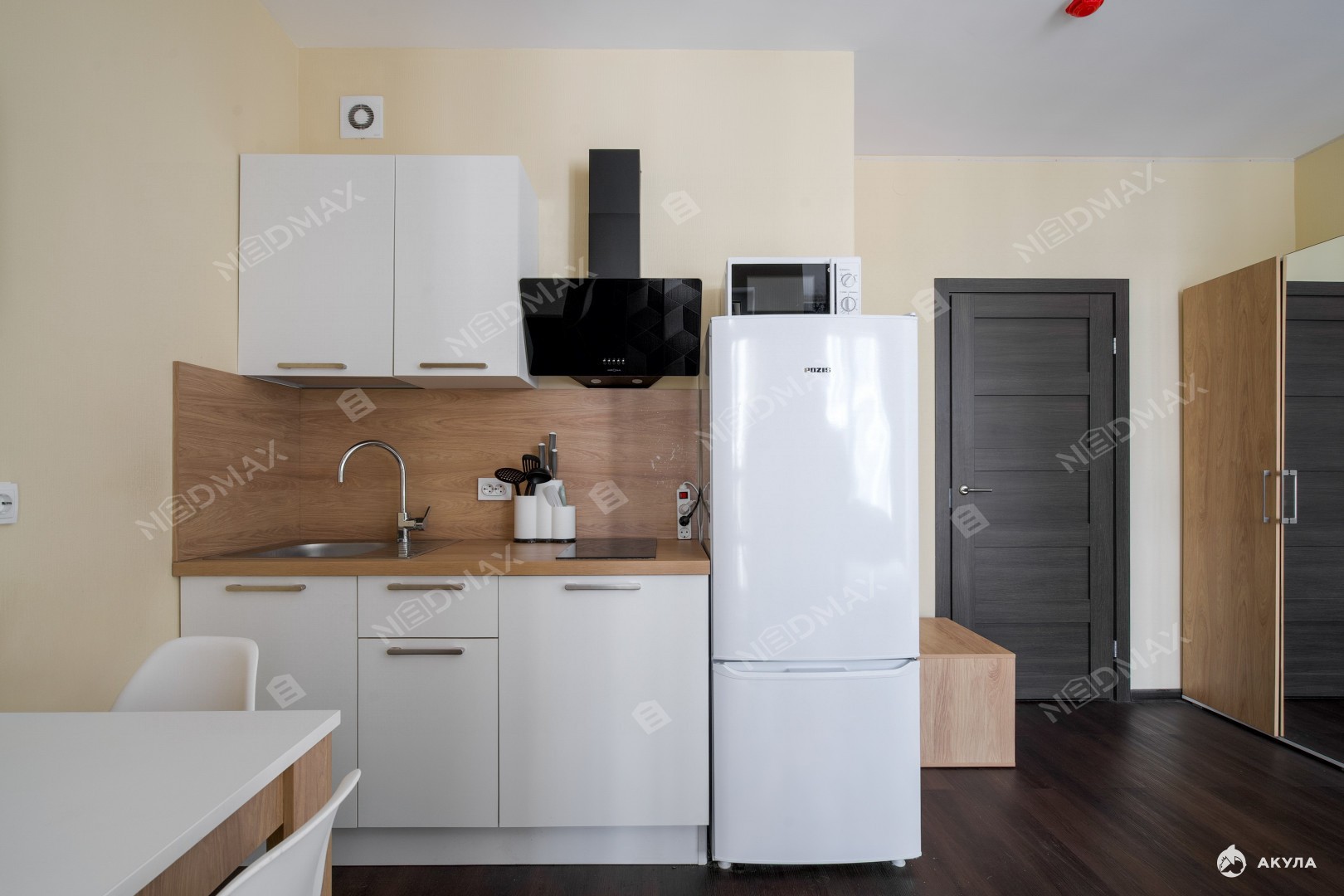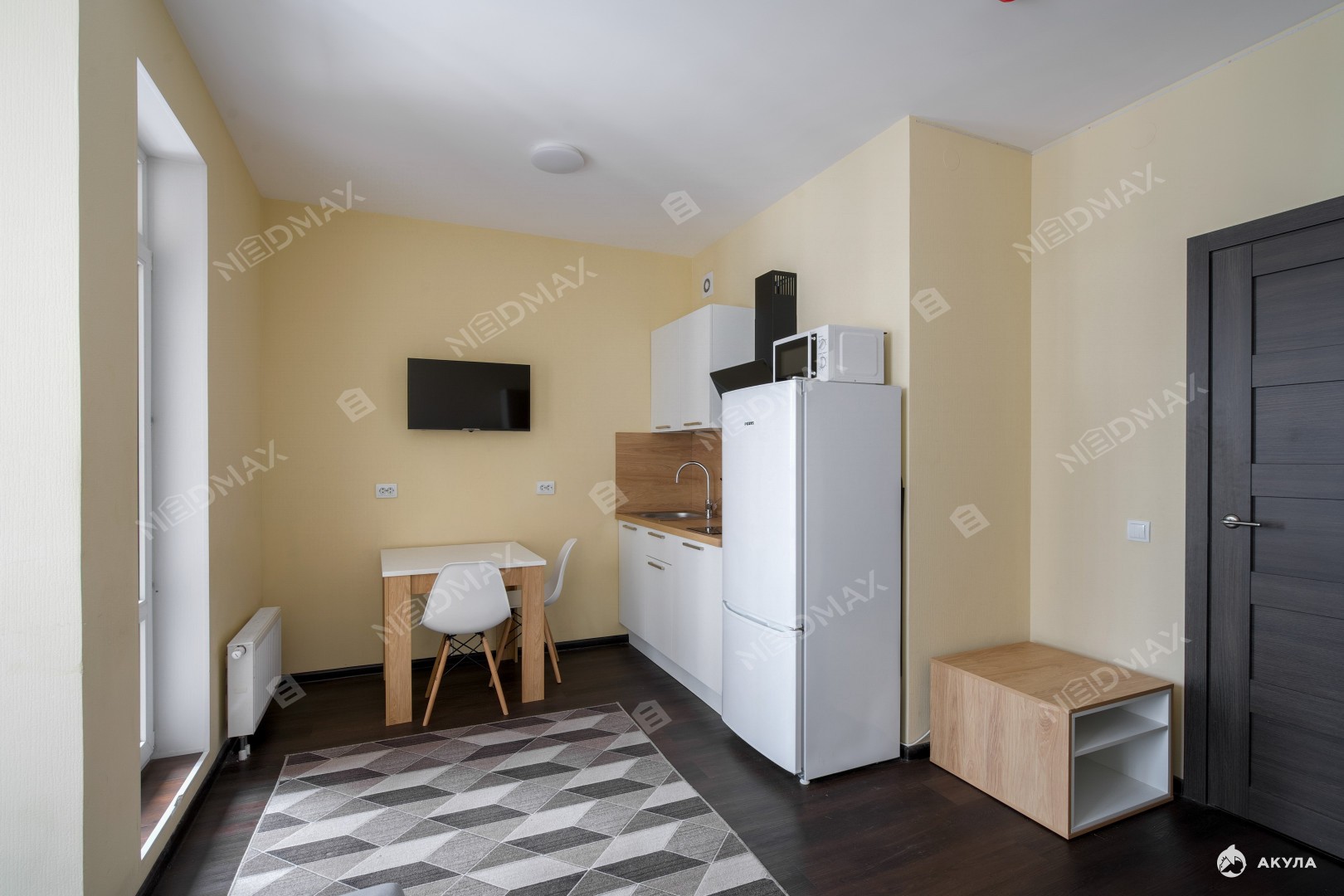 -Площадь студии грамотно разделена на зоны кухни и отдыха, что создаёт комфорт и уют.