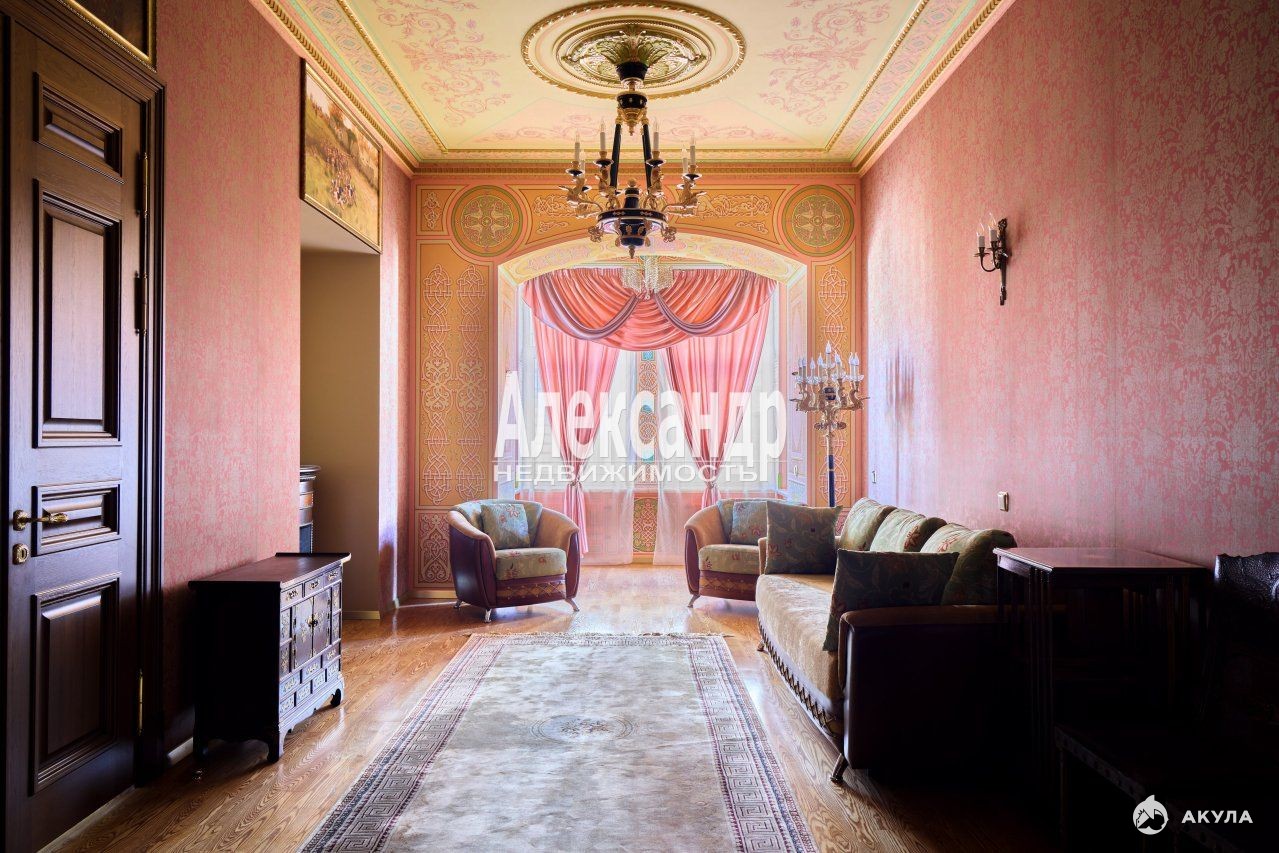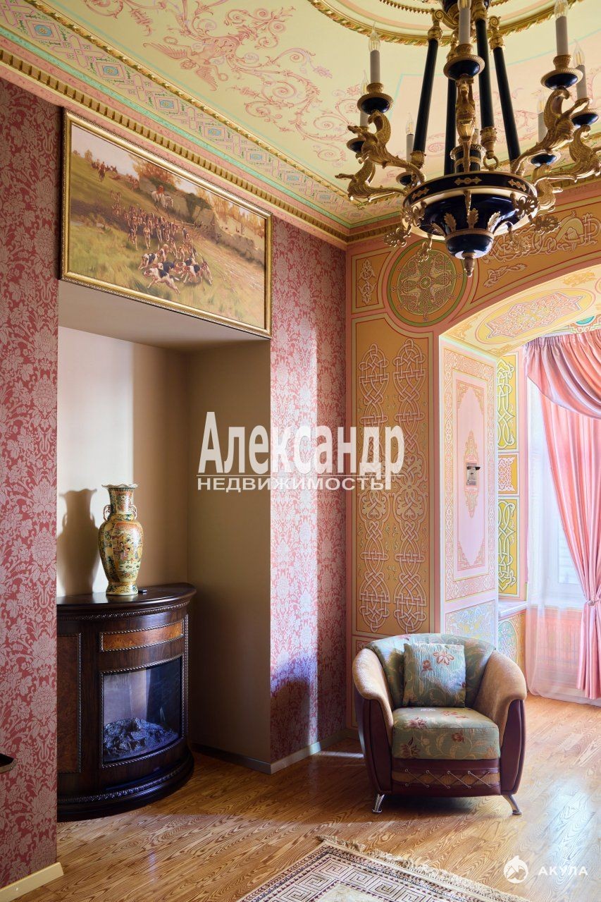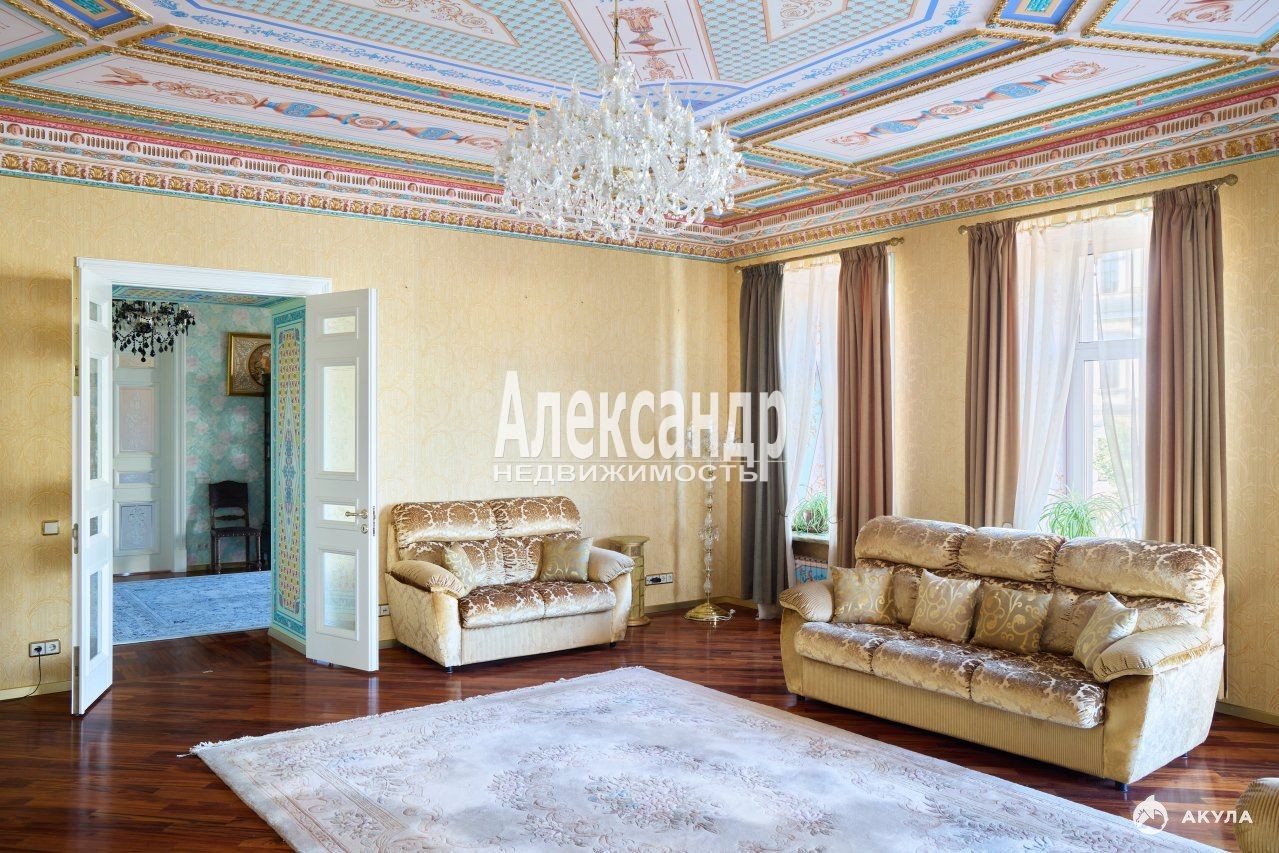 1705424 Уникальное предложение квартиры по местоположению, дому, отделке и интерьеру. Квартира 259, 2 кв.м., пятикомнатная, большая кухня-столовая, три санузла, кладовые, два входа с разных парадных. Готовая к проживанию, не требуется косметический ремонт. Квартира в таком исключительном месте и неповторимом виде будет семейной ценностью и реликвией. Находится в самом центре исторических и культурных мест Санкт-Петербурга, расположение дома на набережной реки Мойки усиливает ее привлекательность. Квартира видовая, из всех окон открывается замечательный вид на реку Мойку, на памятник Николаю I и площадь Исаакиевского собора, легендарный отель Астория, Синий и Красный мосты, роскошный ТД Эсдерс и Схейфальс. В минутах ходьбы Исаакиевский собор, Медный всадник, отель Англетер, Законодательное собрание Санкт-Петербурга, Зимний Дворец, Казанский собор, Спас на Крови, Государственный Эрмитаж, Новая Голландия. Квартира располагается в бывшем доходном доме Корпуса К. Б., построенном по проекту известного архитектора Гешвенда А.Р. Класс проекта - элитный дом, архитектура - эклектика. Собственником квартиры проведен капитальный ремонт, редкий случай в практике ремонта отдельной квартиры, когда новые бетонные перекрытия сделаны между соседними верхними и нижними этажами, заменены все инженерные коммуникации, произведена шумо-изоляция помещений. Городом проведен капитальный ремонт всего дома. Отделка и интерьер выполнены собственником квартиры в историческом санкт-петербургском дворцовом стиле, профессионально и качественно, каждая деталь продумана до мелочей. Роспись потолков, стен и проемов создавалась художниками Академии художеств им. И. Репина и Российской Академию Живописи, Ваяния и Зодчества Ильи Глазунова. Дубовый паркет, двери, оконные рамы и элементы интерьера изготовлены на заказ в санкт-петербургских мастерских. Отдельные элементы стен, проемов, эркеров и подоконники отделаны натуральным камнем оникс. Восстановленный действующий камин с аутентичными изразцами. Квартира обустроена предметами интерьера, соответствующие элементам отделки. Состояние квартиры - без износа, не требует вложений. В аренду не сдавалась, постоянно в квартире не проживали. Использовалась для приезда в отпуск или праздники. Продумана планировка квартиры, две отдельные спальни с санузлами, кабинет, зал-гостиная, второй кабинет или столовая, большая кухня, третий санузел, анфилада с продуманной системой проходов к комнатам. Три видовых эркера, высокие потолки. Квартира располагается на 2 этаже пятиэтажного дома, лифт. Вход в парадное с набережной реки Мойка и два раздельных - с парковки дома, расположенной в закрытом внутреннем дворике. Доступ к паковке через ворота с пультом. Чистые и опрятные парадные. На первом этаже офисные помещения с отдельным входом. Дом полностью заселен статусными жильцами. На этаже по 2 квартиры.