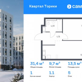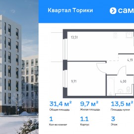 Строим кварталы для жизни с заботой о будущем. Предлагается 1-комнатная квартира комфорт-класса 31, 4 кв.м в корпусе 1.1 на 12 этаже, в ЖК «Квартал Торики» Квартира с предчистовой отделкой. Доступность дополнительных опций уточняйте у застройщика. Приобрести квартиру возможно...