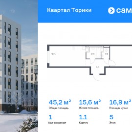 Строим кварталы для жизни с заботой о будущем. Предлагается 1-комнатная квартира комфорт-класса 45, 19 кв.м в корпусе 1.1 на 5 этаже, в ЖК «Квартал Торики» Квартира с предчистовой отделкой. Доступность дополнительных опций уточняйте у застройщика. Приобрести квартиру возможно...