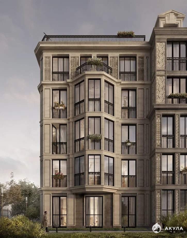 Проект AMO воплощает изящность линий. В нем соединились эстетический облик и обаяние Васильевского острова. Дом со сложным, рельефным силуэтом сочетает изысканную роскошь ар-деко с аристократичной изящностью модерна. Растительным орнаментом фасада можно любоваться бесконечно.