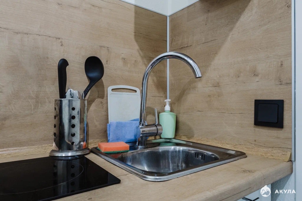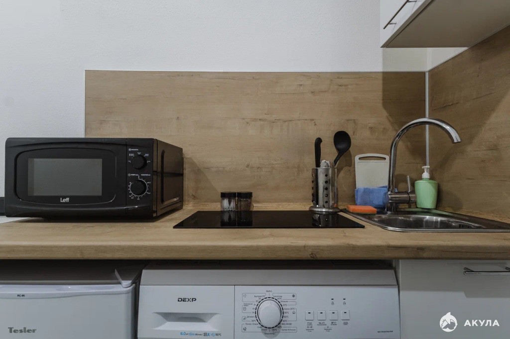 — Техника: ТВ, плита индукционная, стиральная машина, холодильник, бойлер, фен, светильники.
