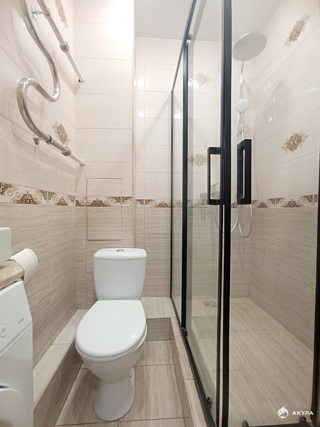 Удобная ванная комната с прекрасной отделкой. Жилая комната почти квадратной формы, что в совокупности с высокими потолками 2, 74 м создает ощущение полноценной однокомнатной квартиры.