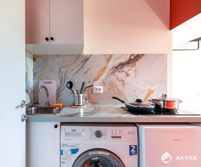 — Техника: ТВ, плита индукционная, стиральная машина, холодильник, бойлер, фен, светильники.