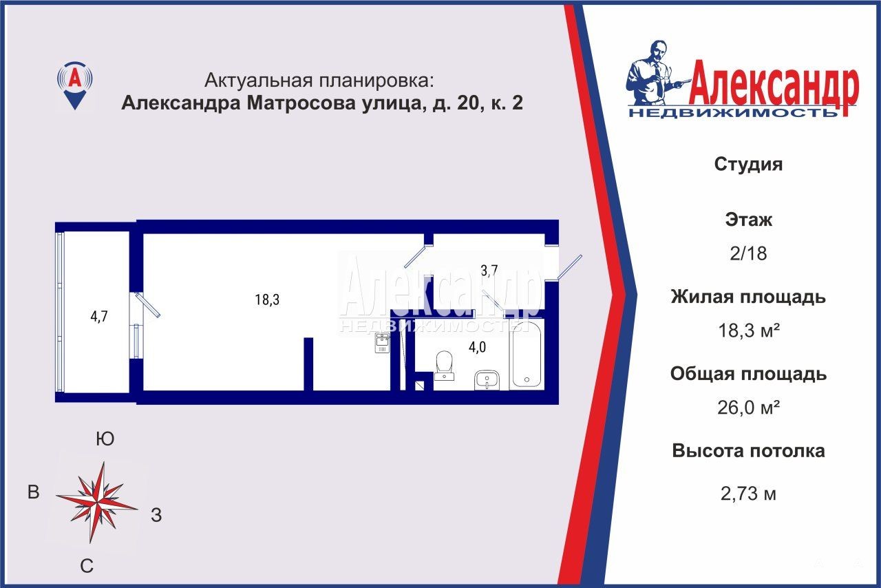 Студия общей площадью фактически 30 кв.м (с учетом площади лоджии 4, 7 кв.м) расположена на 2 комфортном этаже ЖК, выполнен косметический ремонт, обустроена лоджия, которую можно использовать как рабочее место, выделена кухонная зона, просторный совмещенный санузел с ванной. Окна выходят на тихую улицу Матросова, восточное направление.