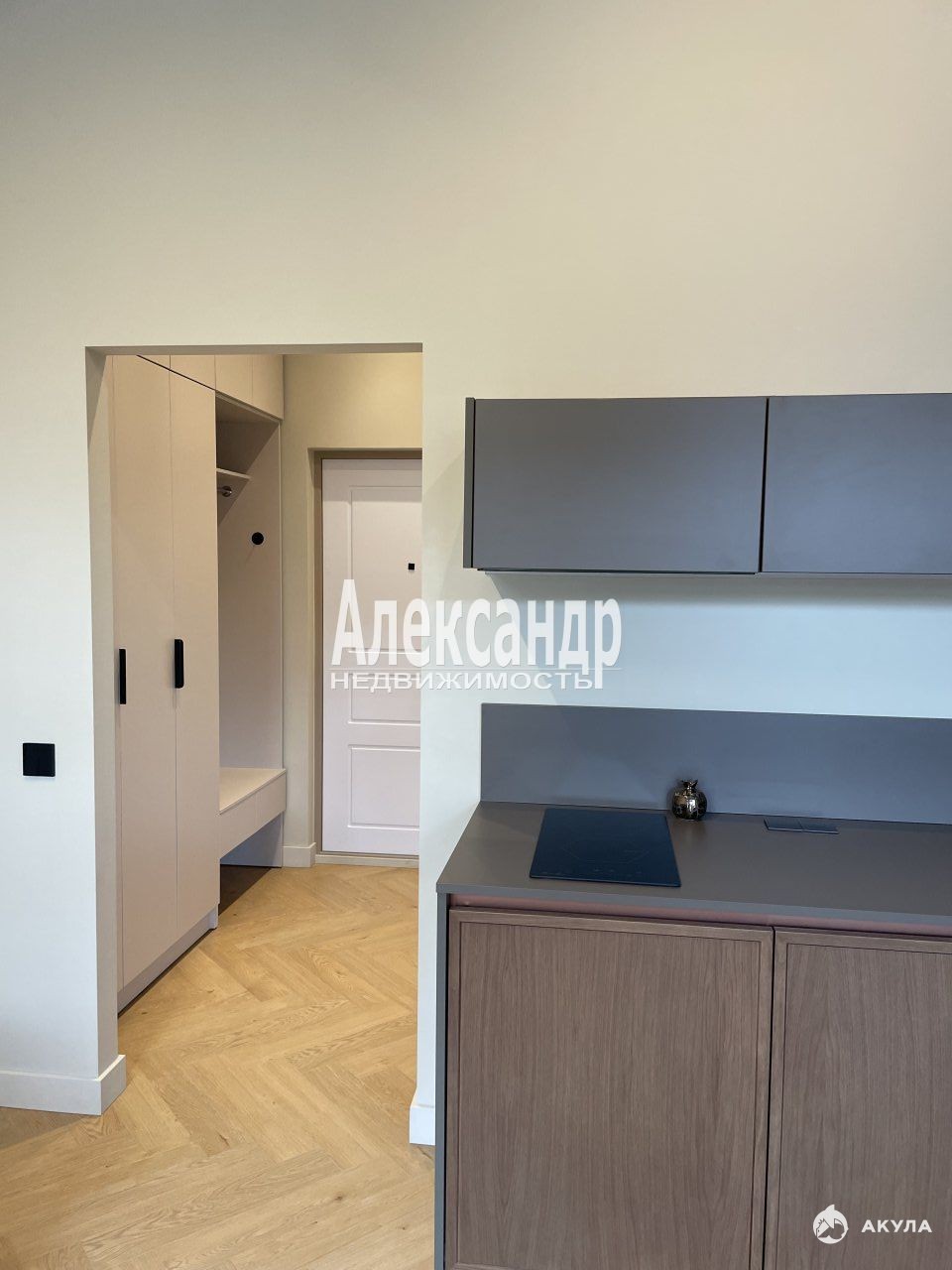 — кухня со встроенной техникой: индукционная плита, посудомоечная машина, холодильник, вытяжка