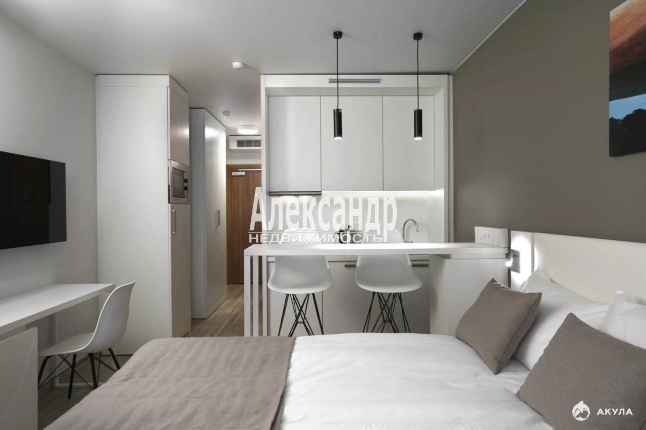 Студия укомплектована современной кухней, бытовой техникой (посудомоечная машина, стиральная машина) и мебелью.