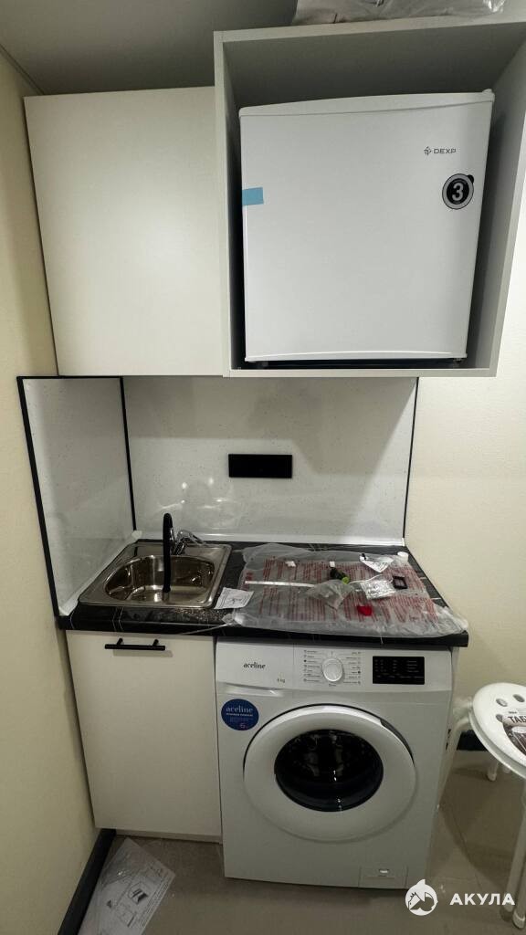 — Техника: ТВ, плита индукционная, стиральная машина, холодильник, бойлер, фен, светильники.