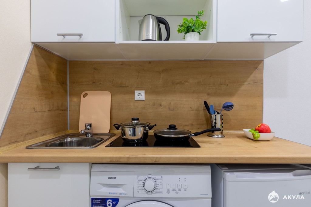 — Техника: ТВ, плита индукционная, стиральная машина, холодильник, бойлер, фен, светильники.