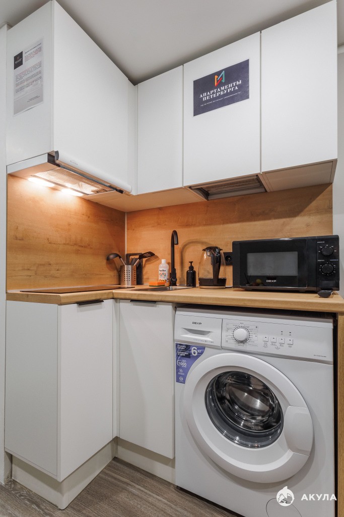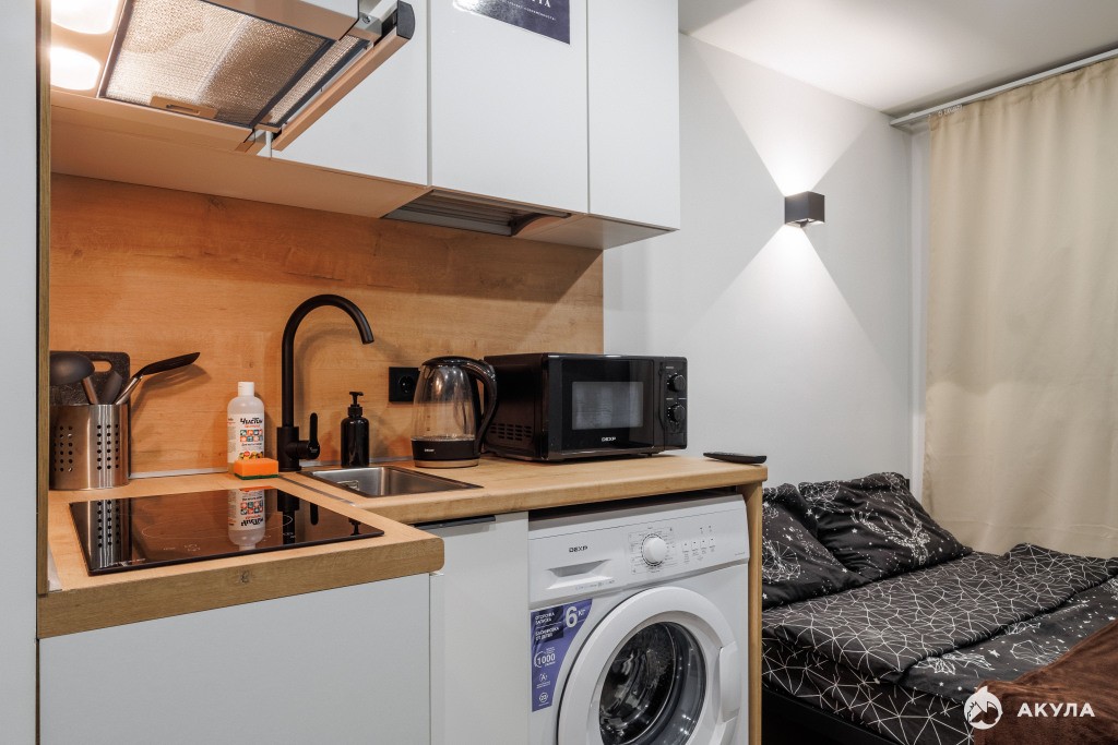 — Техника: ТВ, плита индукционная, стиральная машина, холодильник, бойлер, фен, светильники.