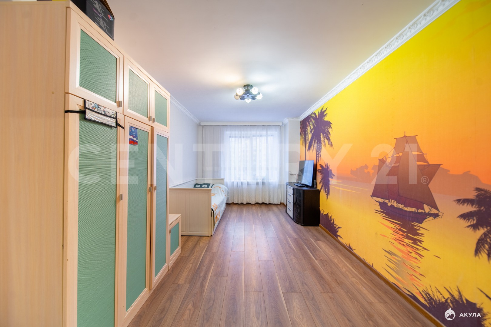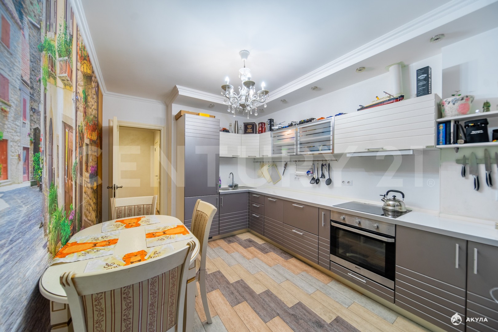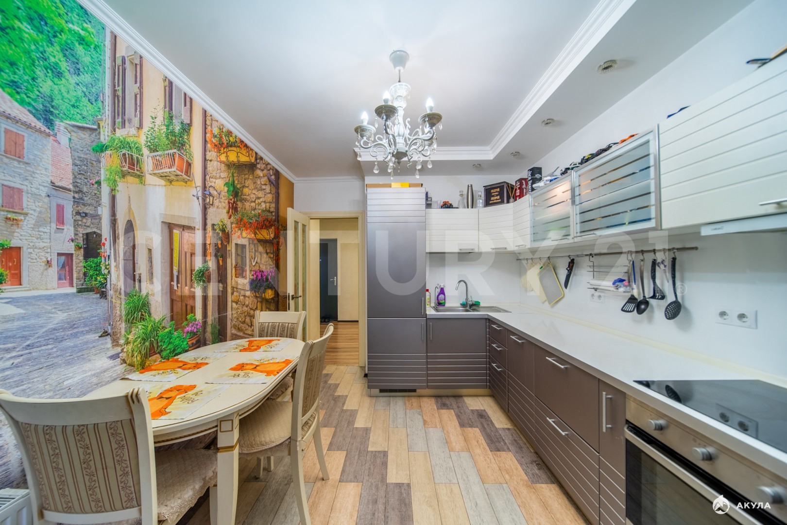 В квартире остаётся : кухонный гарнитур со встроенной техникой( плита, духовой шкаф, посудомоечная машина, холодильник), стиральная машина в ванной комнате, в мастер-спальне шкаф-кровать , письменный стол и диван, система хранения в гардеробной, в детской комнате кровать и шкаф для хранения, прихожая в коридоре.