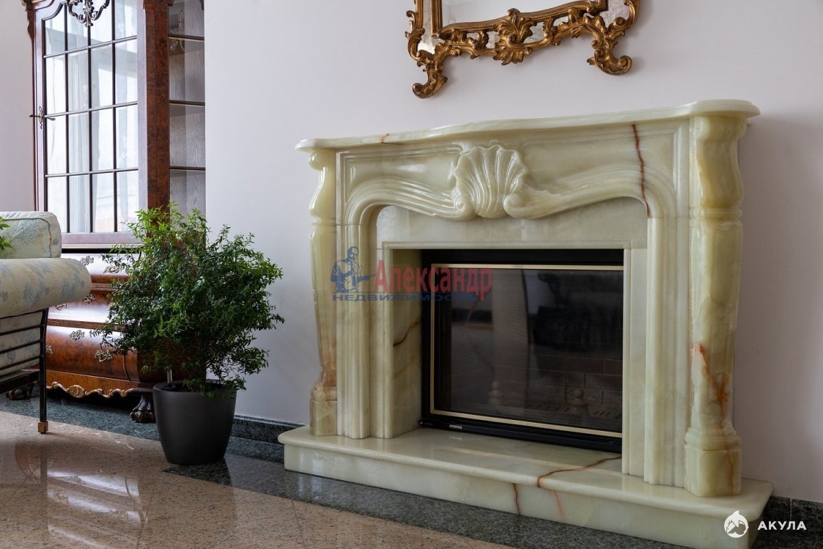 второй этаж (непосредственно квартира - 277.8 кв.м) выполнен в двух уровнях-полуэтажах: на первом гардеробная, гостевой с/узел, гостиная с камином из натурального камня «Оникс» и кухня- столовая с камином из мрамора;