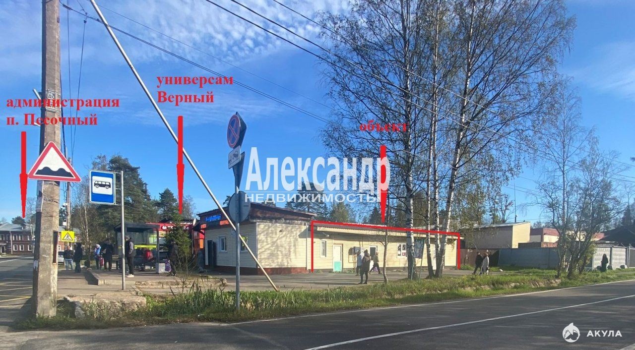 Остановка общественного транспорта прямо у помещения, в 200 м ж/д станция «Песочная», в 130 м отделение Почты России, администрация МО п. Песочный, вокруг жилой массив, в 600 м пляж на озере Курортного лесопарка, что увеличивает поток покупателей в курортный дачный сезон.