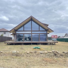 Арт. 92502441. Одноэтажный дом из клеёного бруса (200*140(h))мм на участке 118 в КП Сосновские горки в готовности "под чистовую отделку". Установлен на железобетонной плите толщиной 200 мм с ростверком и утеплителем под плитой (шведский фундамент). В плите проложены трубки для утепления...