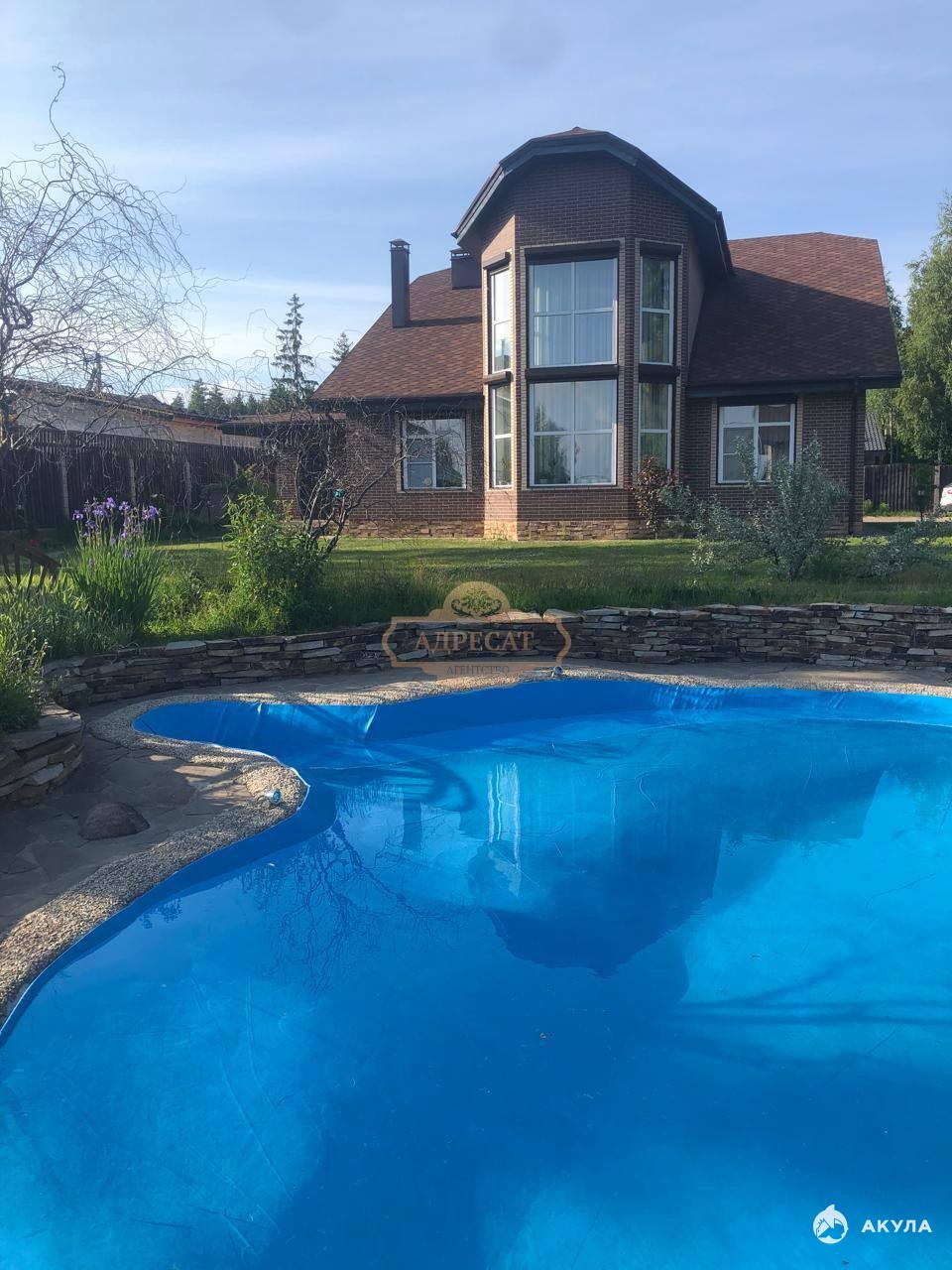 Продуман ландшафтный дизайн участка. Просторный бассейн, рулонный газон, высажена зеленая изгородь, молодой плодородный сад. Домик для барбекю с костровой зоной, выполнены пешеходные дорожки.