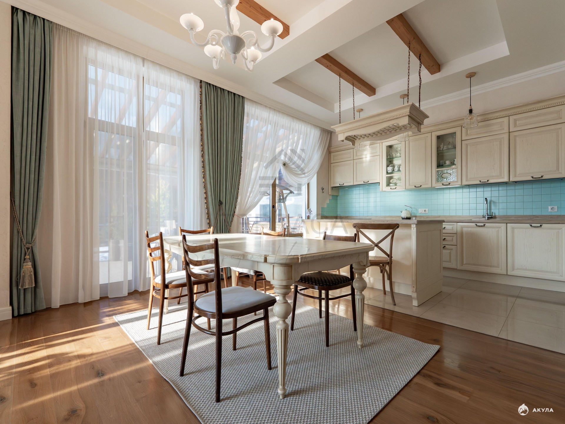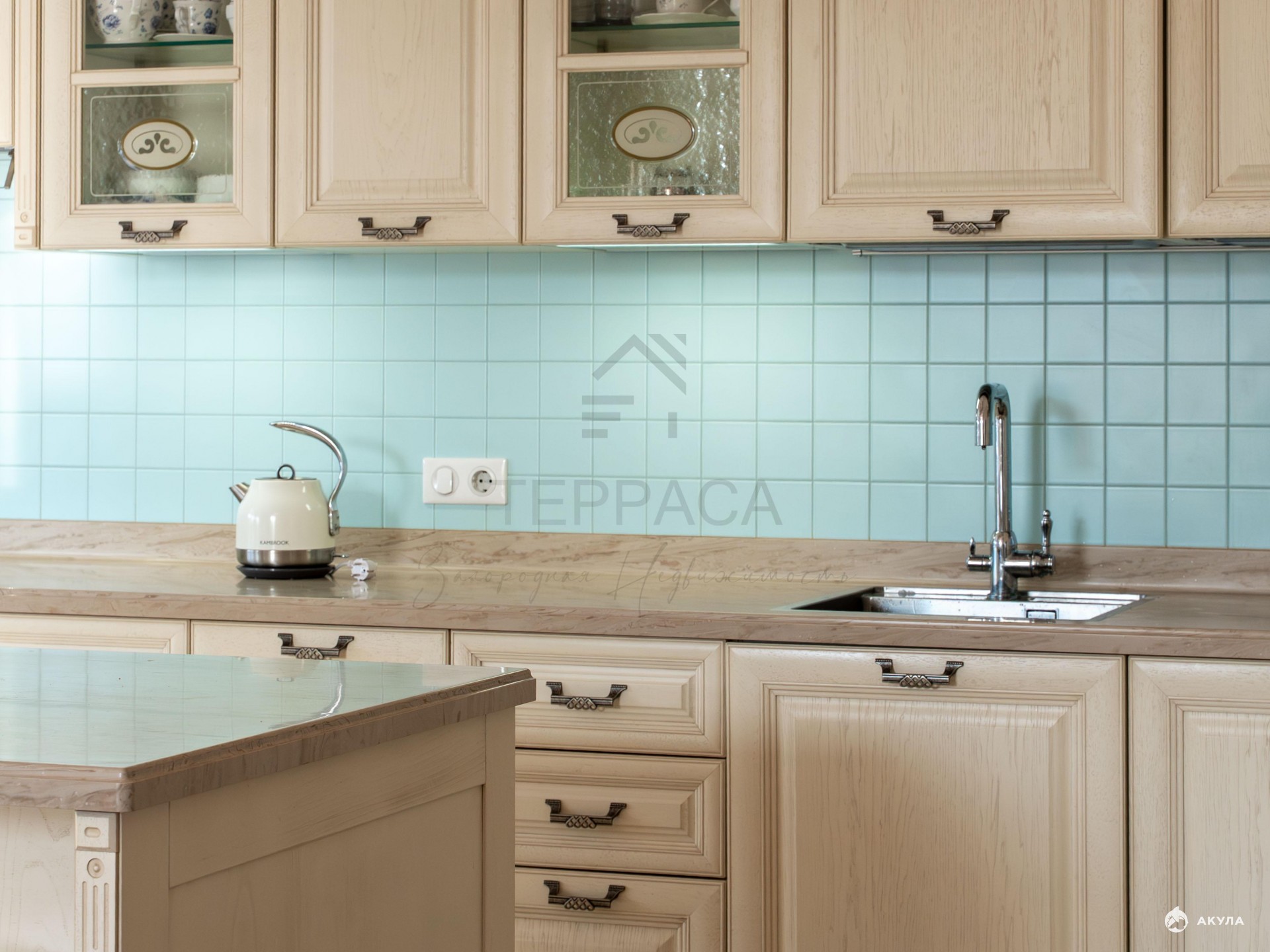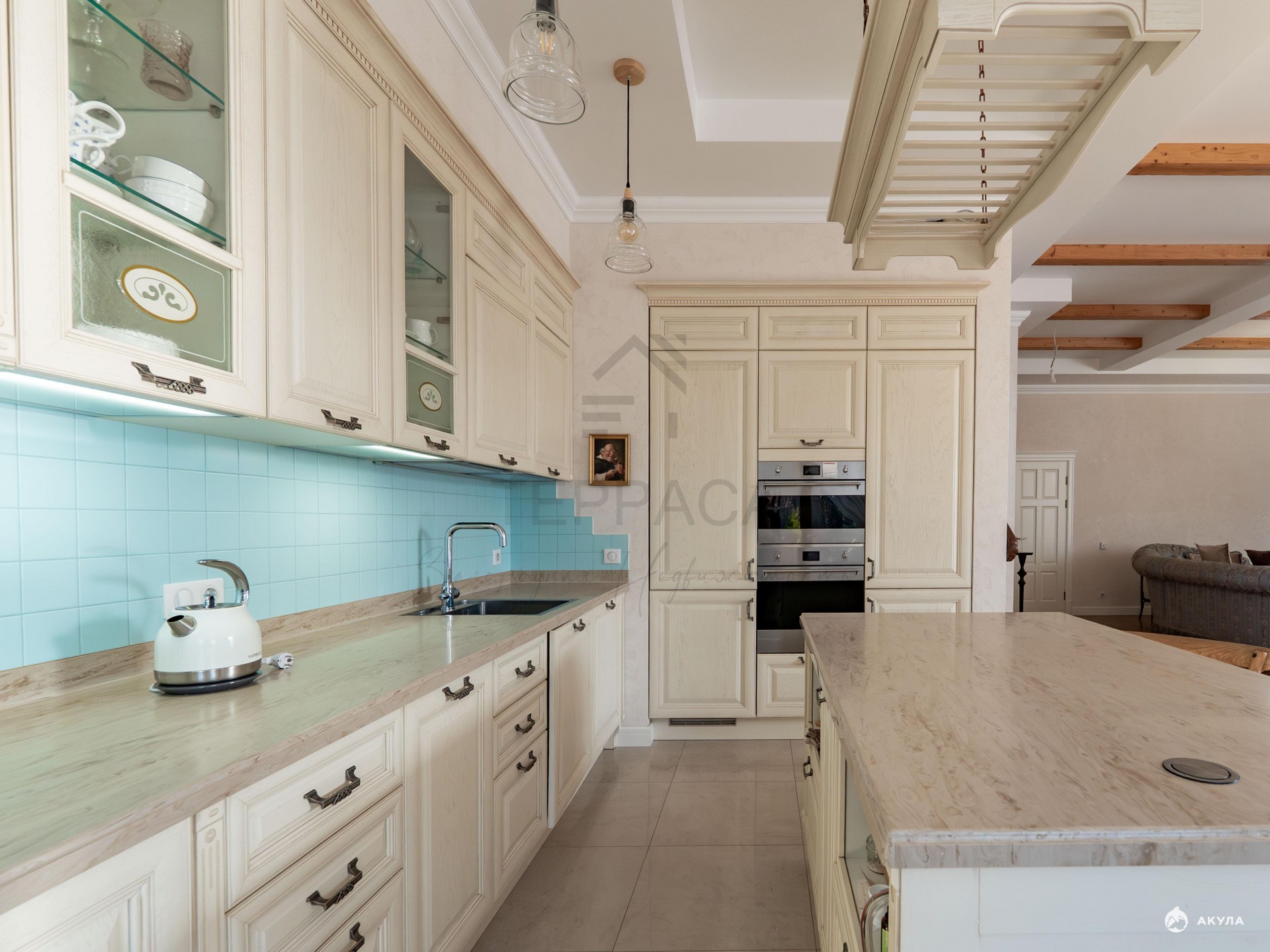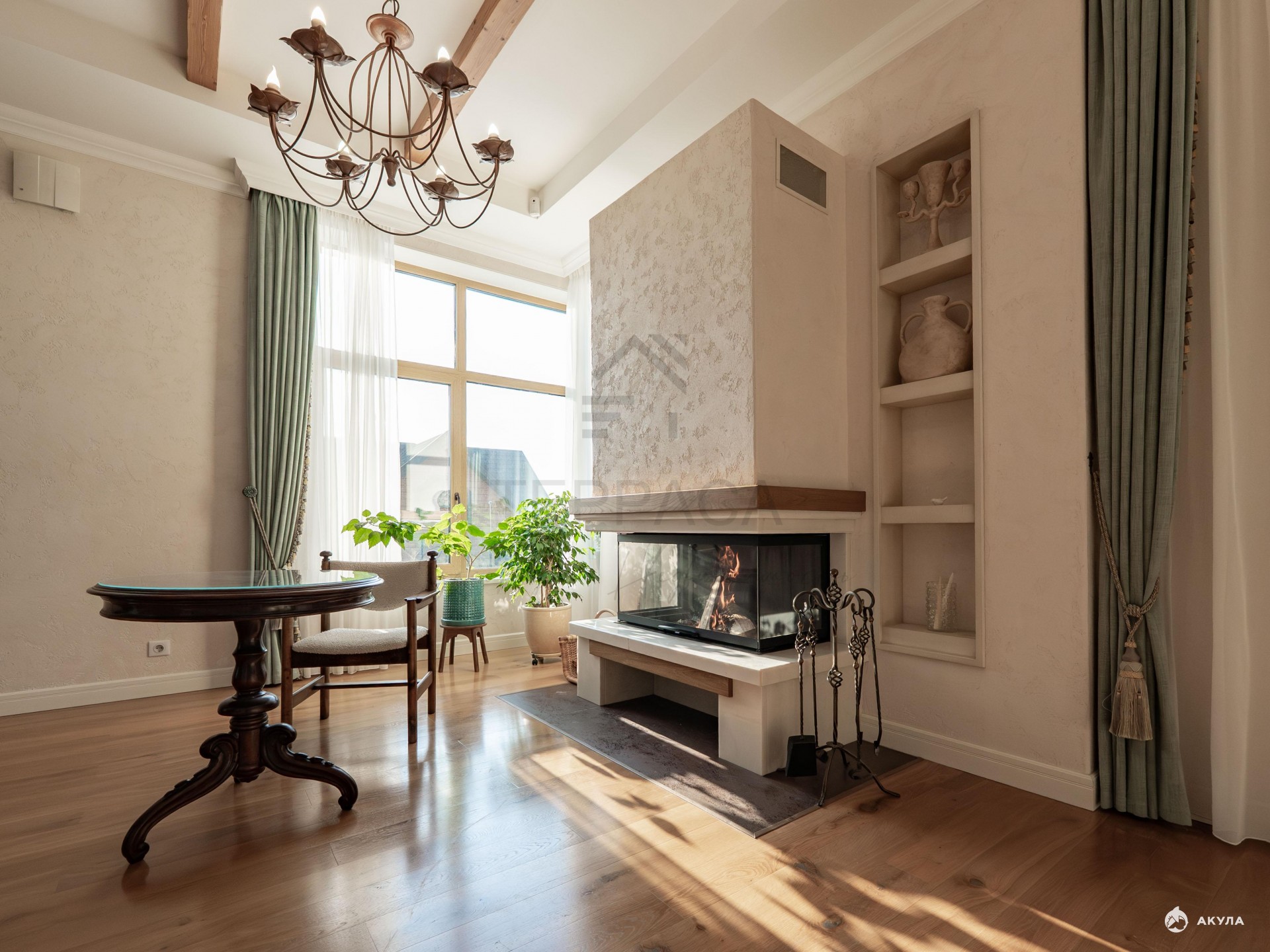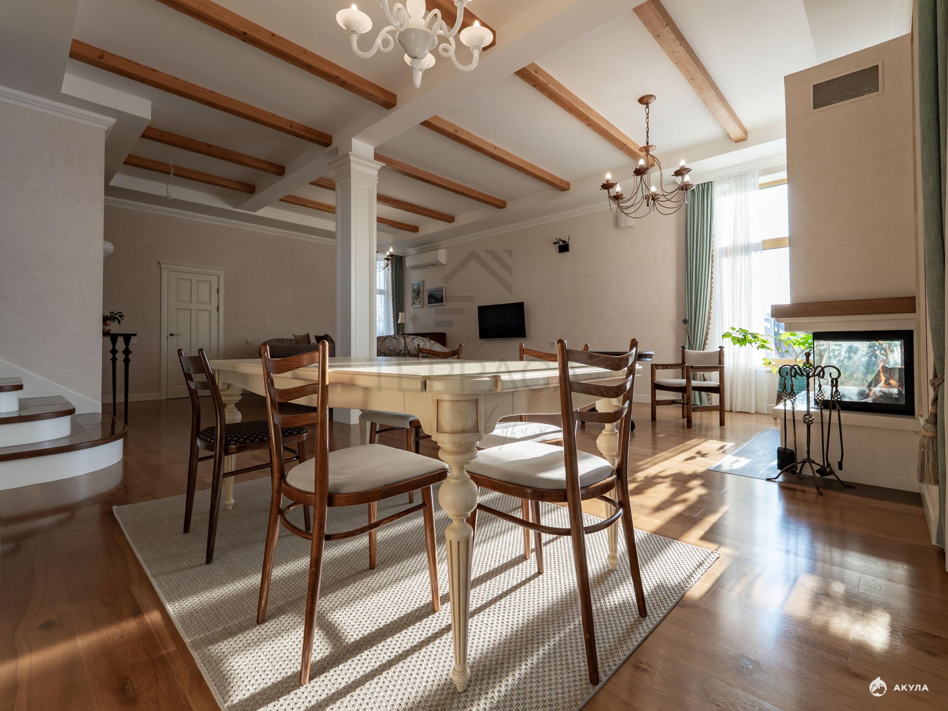 · На первом этаже уютная кухня-гостиная с камином и выходом на террасу. Гардероб и постирочная.