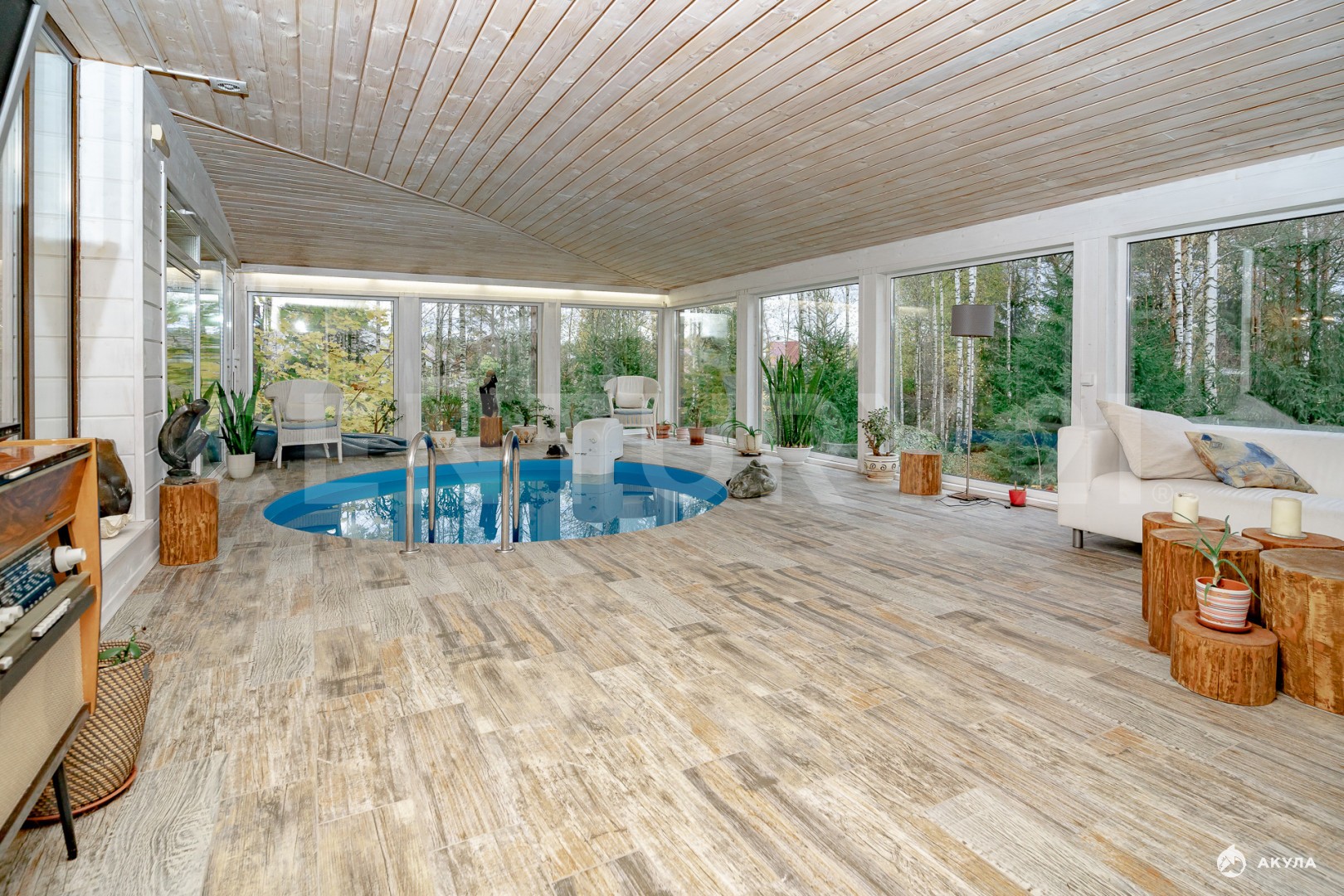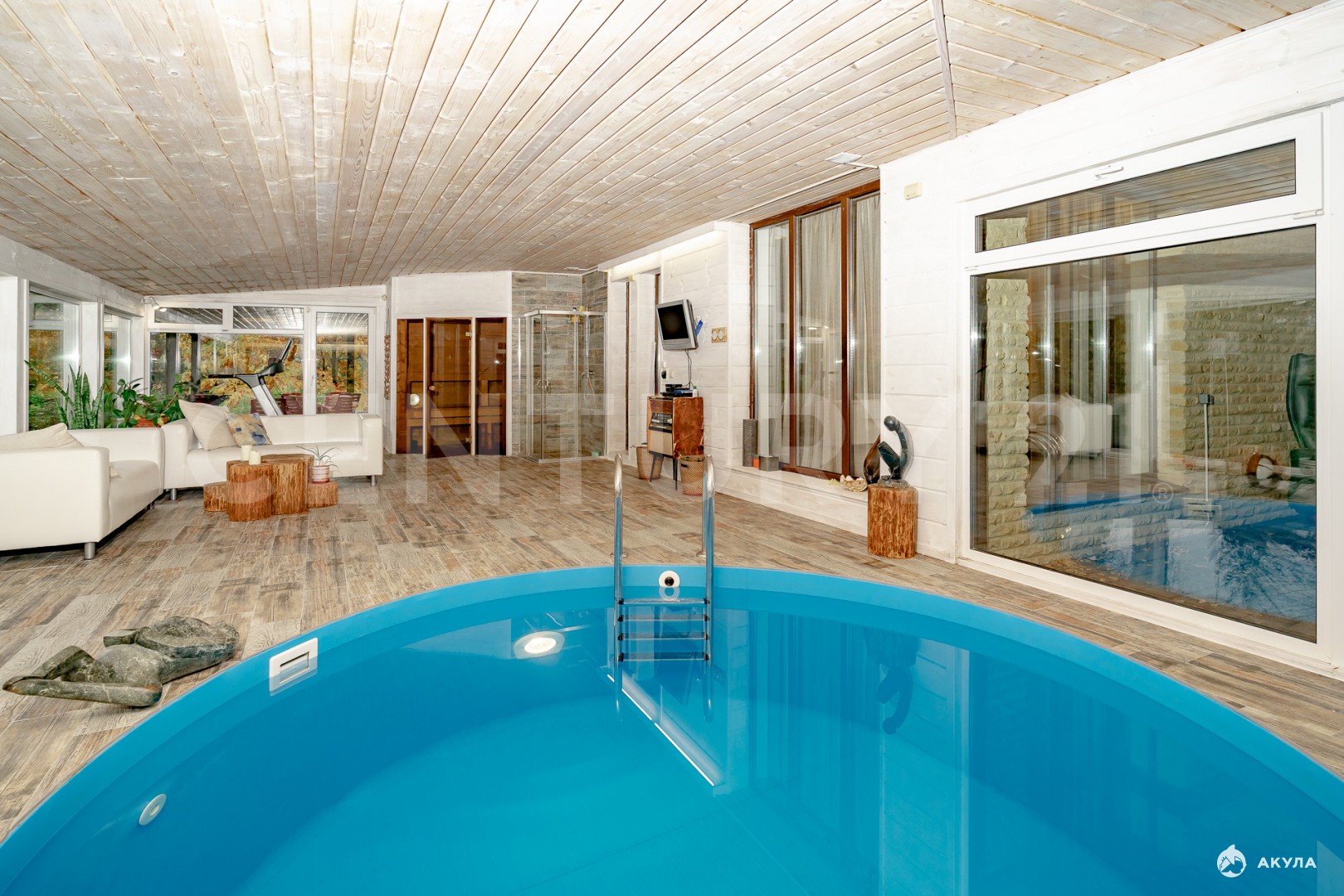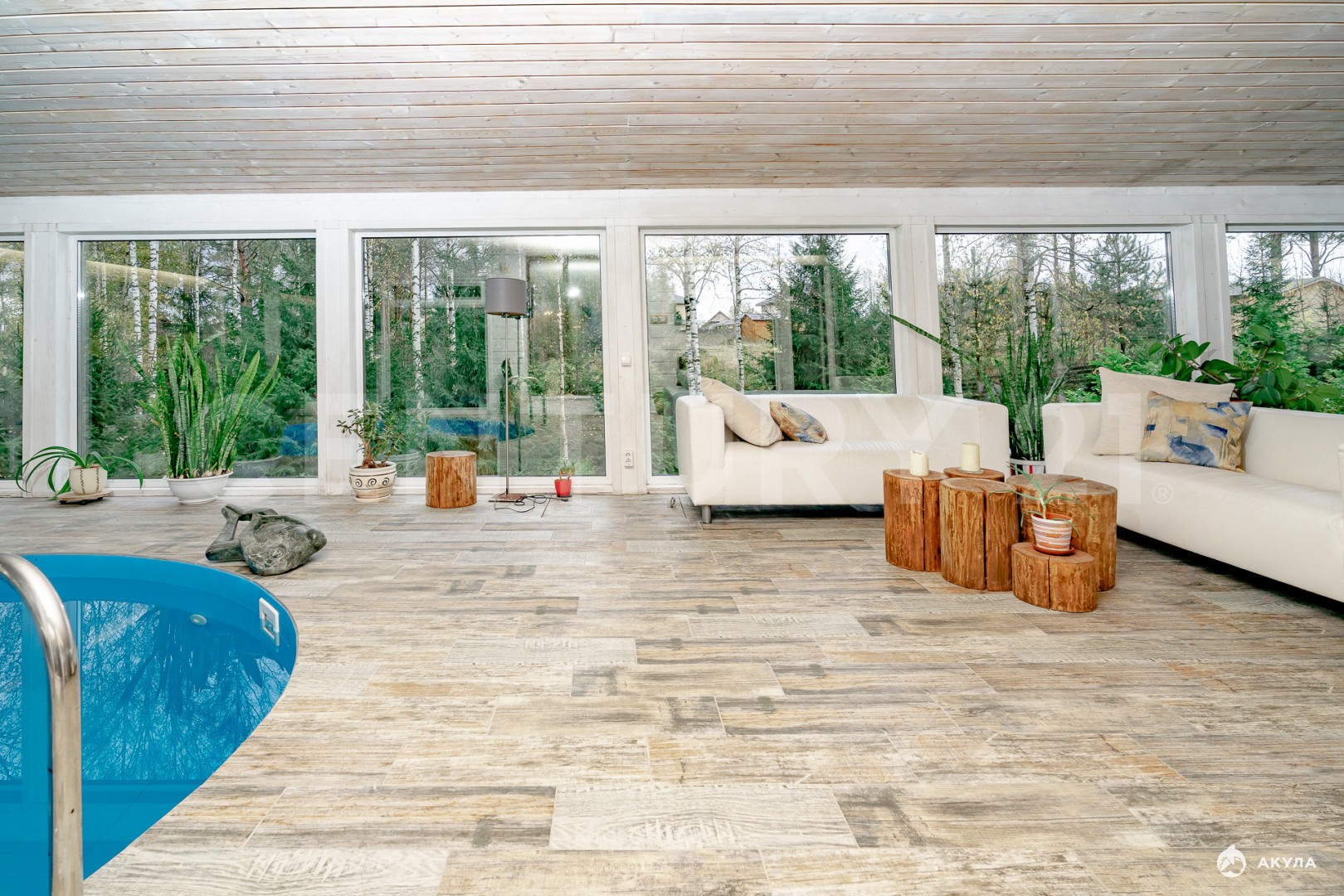 Приватная СПА-зона в пристройке: сауна с эффектом русской парной, бассейн с противотоком, зона отдыха и душ с выходом в парк.