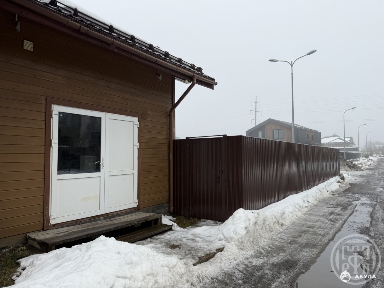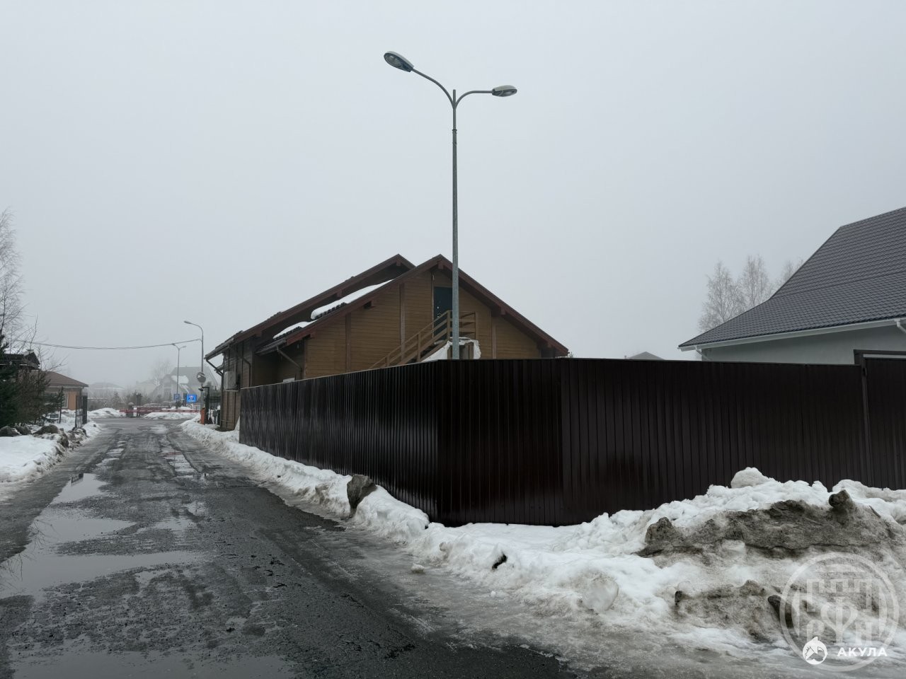 Участок частично огорожен высоким сплошным забором, что создаёт приватность и дополнительную безопасность. Дом расположен в коттеджном посёлке круглогодичного проживания со спокойной атмосферой.