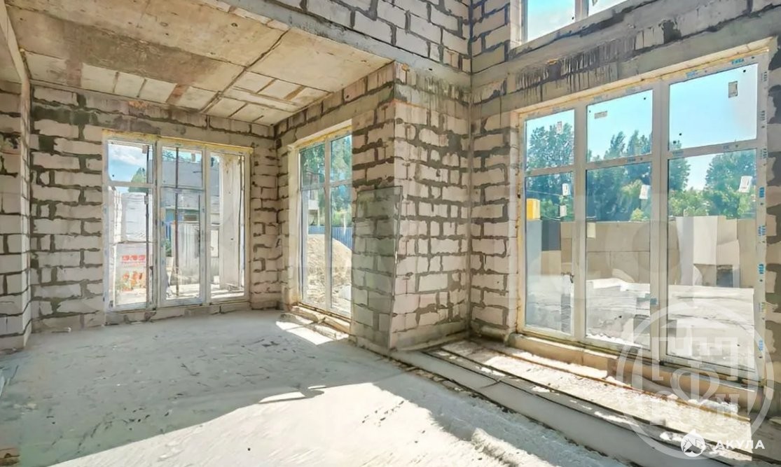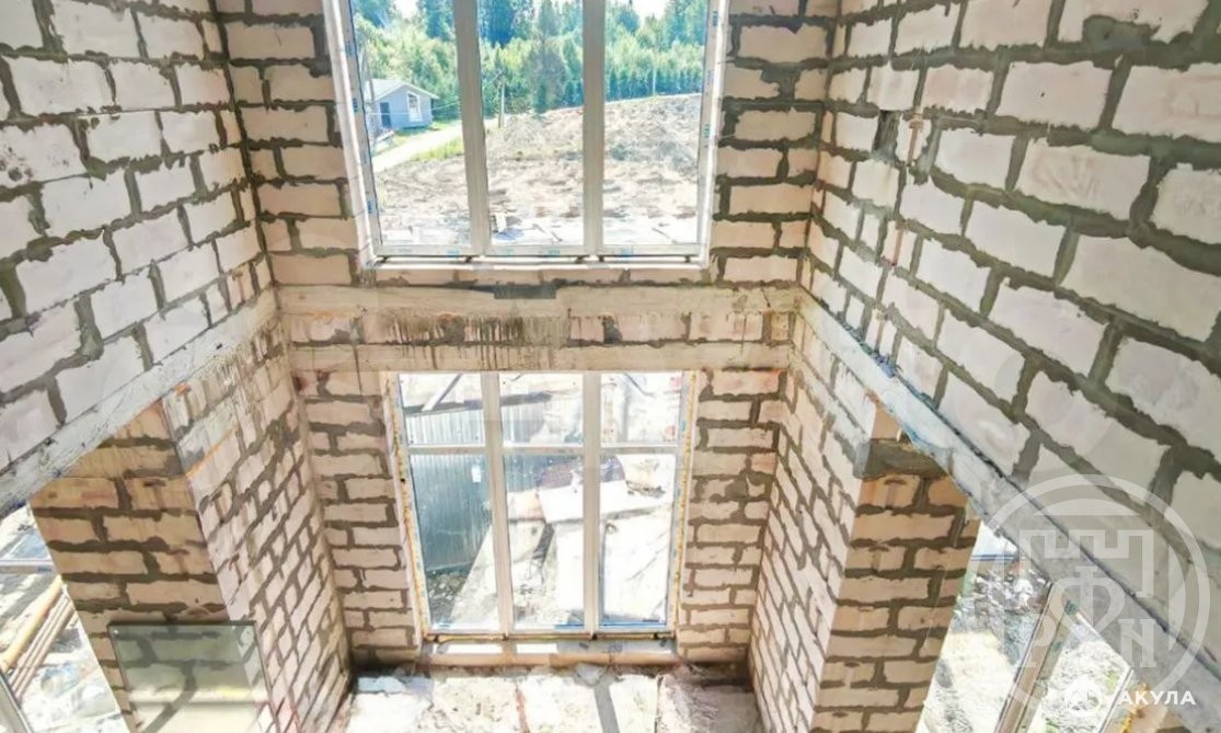 Этап строительства: оштукатуренная коробка со стеклопакетами.