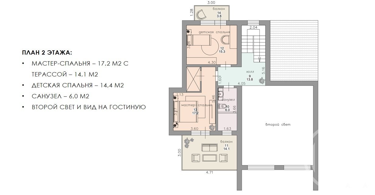 4 просторные спальни с высокими потолками и 2 балконами