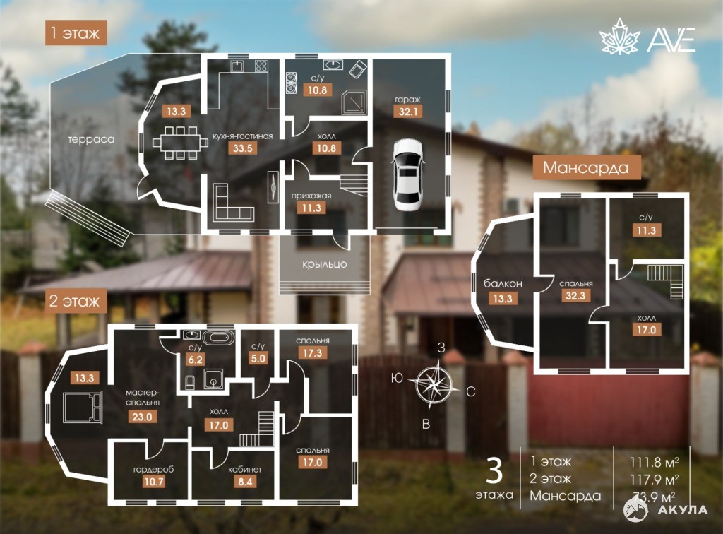 — Третий, мансардный этаж — полноценное жилое пространство с большой хозяйский спальней, санузлом и выходом на балкон с видом на зелёные кроны и питомник с разнообразными растениями.