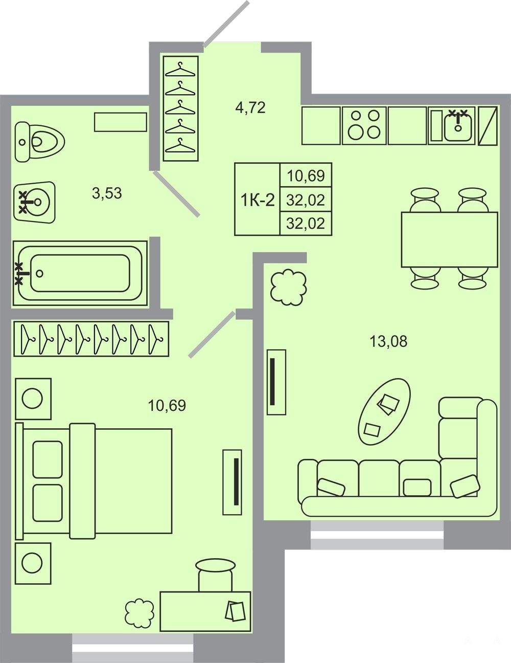 Жилая площадь 10.69 м2, кухня 13.08 м2, чистовая отделка, комнаты изолированные.