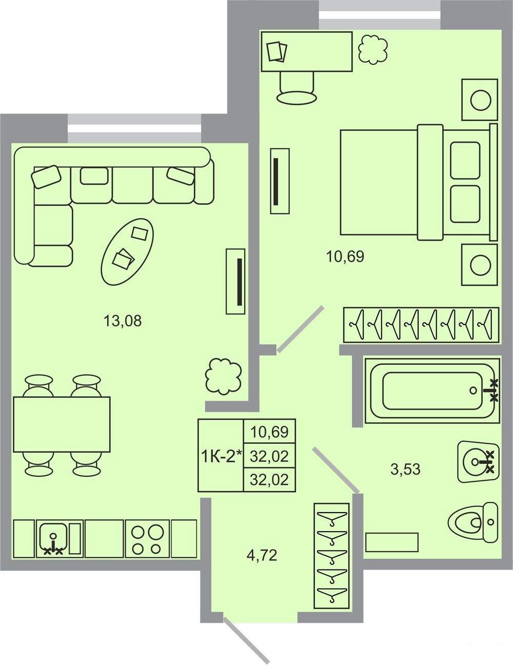 Жилая площадь 10.69 м2, кухня 13.08 м2, чистовая отделка, комнаты изолированные.