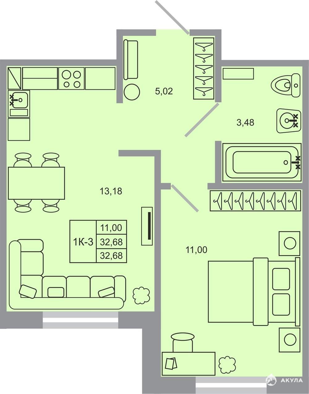 Жилая площадь 11 м2, кухня 13.18 м2, чистовая отделка, комнаты изолированные.